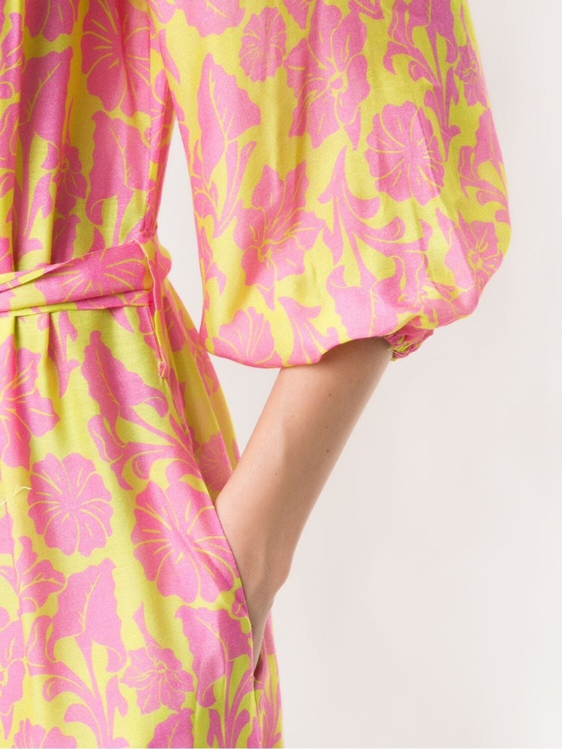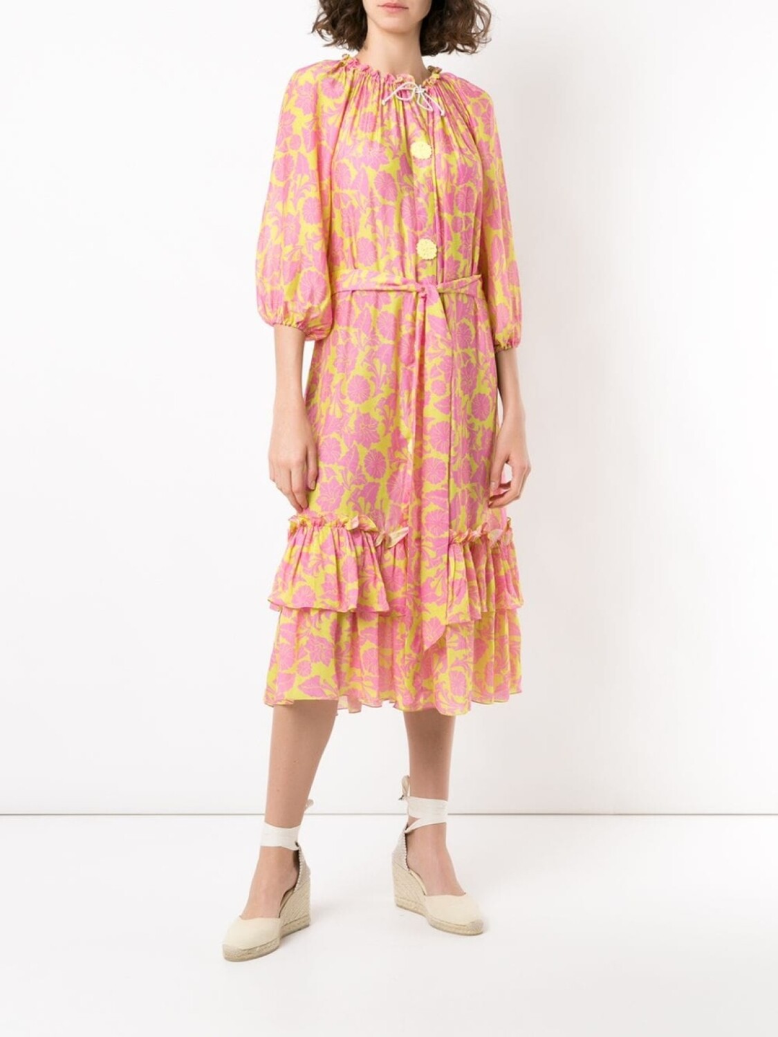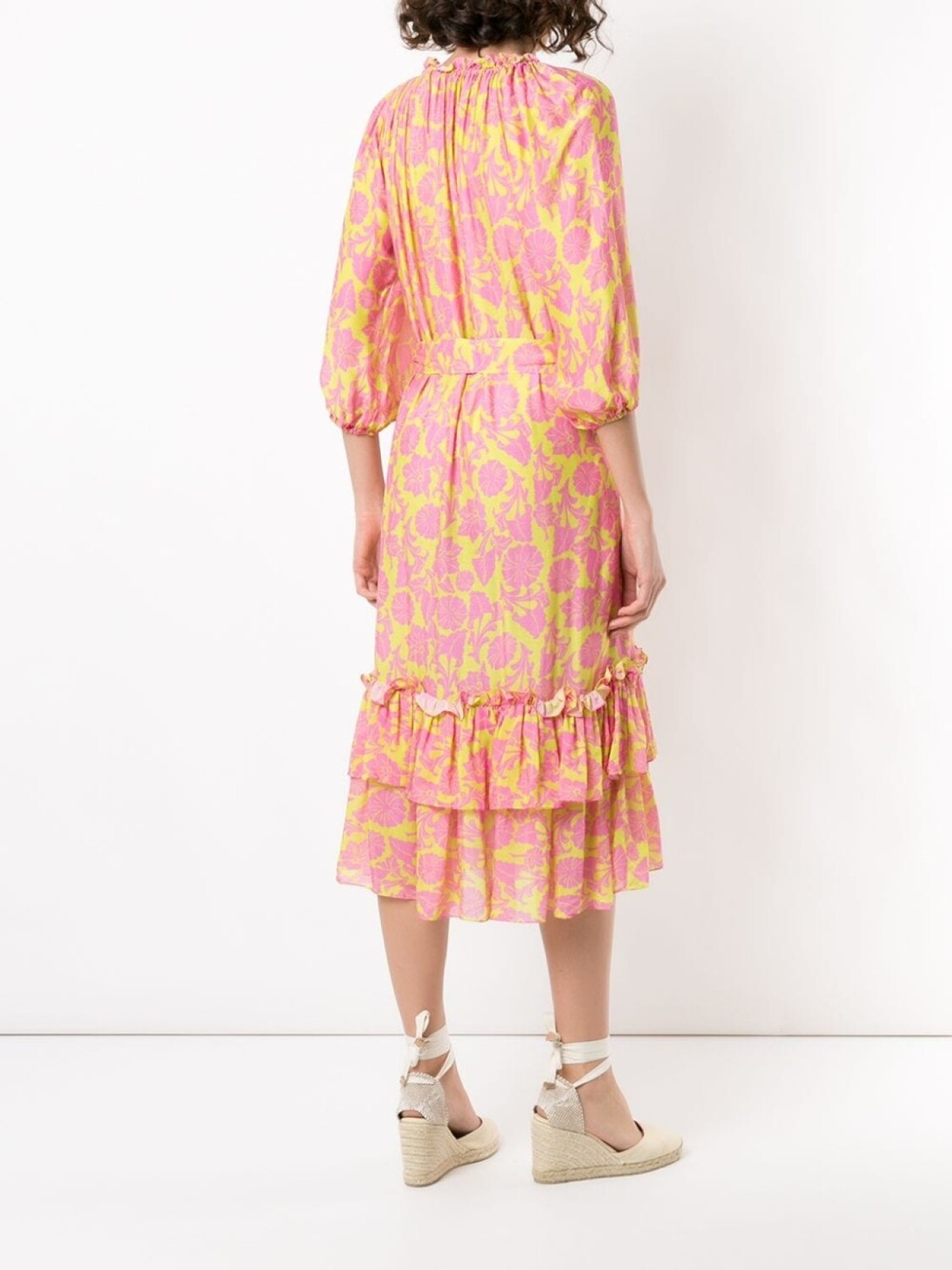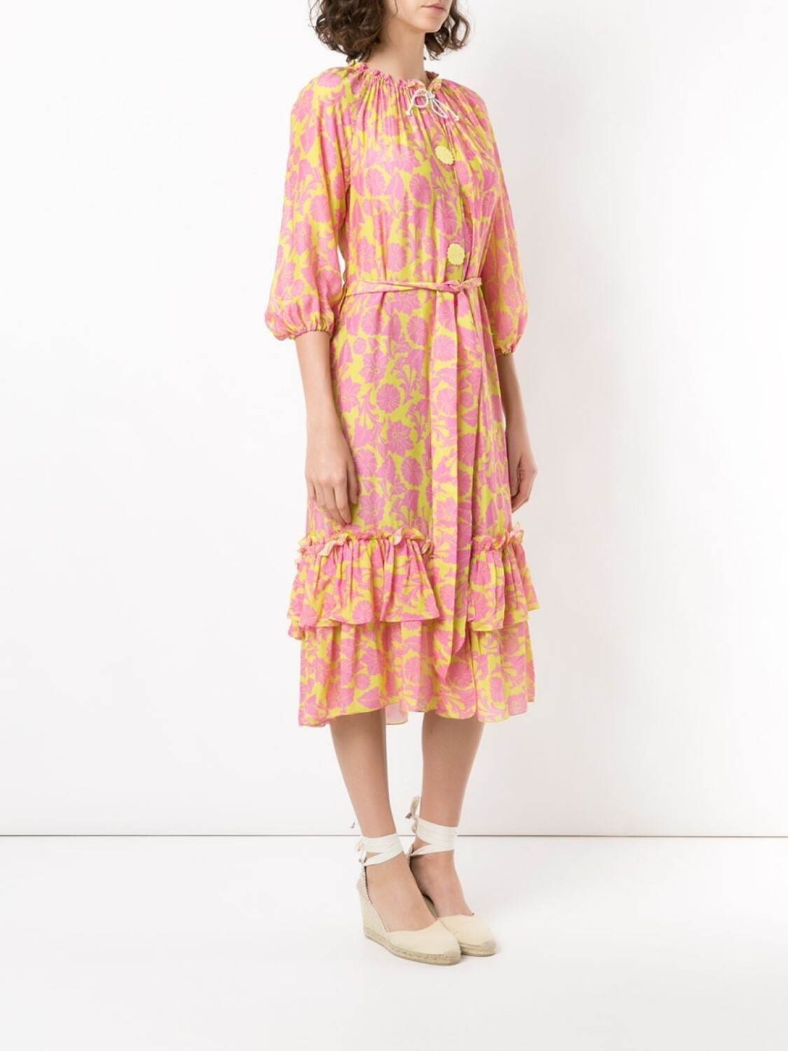 Платье миди Valerie от Clube Bossa. Круглый вырез, горловина на ленточной завязке, присборенные детали, рукава три четверти, застежка на пуговицах спереди, ремень на талии, слои из рюшей и ремень на талии. Цвет: желтый.