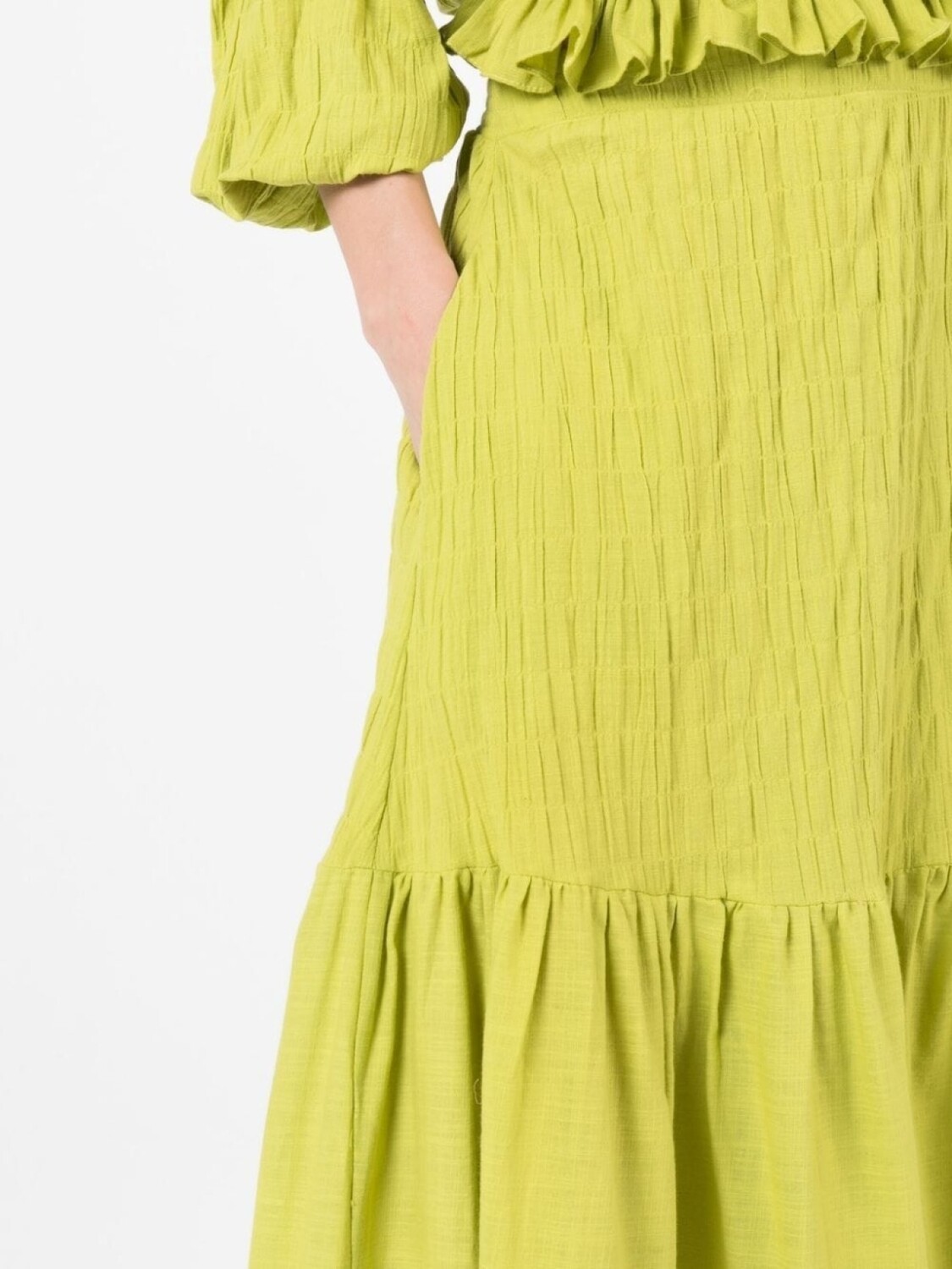 Вставки, жатый эффект, два вшитых кармана по бокам и длина миди.