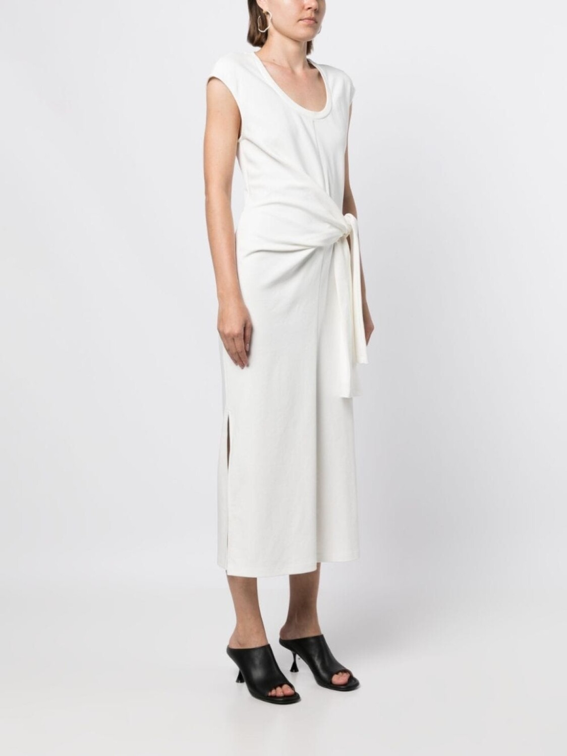 Белый, хлопок, расклешенный крой, U-образный вырез, без рукавов, перекрученная деталь и длина миди.