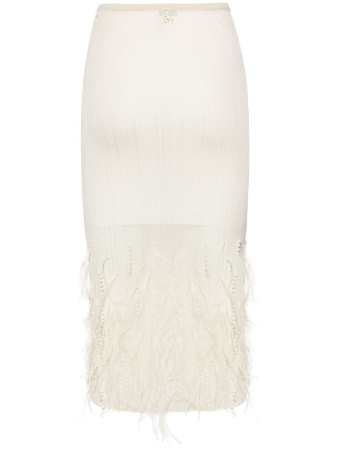 Белый, тонкая вязка, искусственный жемчуг и страусиные перья, золотистый металлический логотип, средняя посадка, прямой подол, длина миди, съемное платье-комбинация длины мини