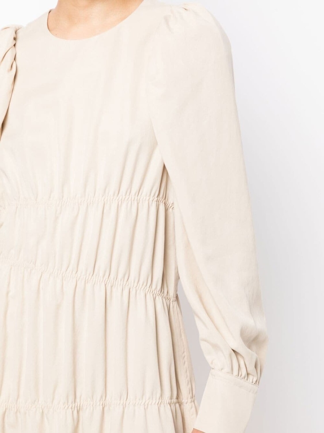 Светло-бежевый, смесовый TENCEL™, детали с оборками, круглый вырез, застежка на пуговицу сзади, объемные рукава, манжеты на пуговицах, ярусная юбка и прямой подол. Ответственный выбор: Этот товар как минимум на 50% состоит из материалов, которые признаны более безопасными для окружающей среды или сертифицированы независимыми организациями.
