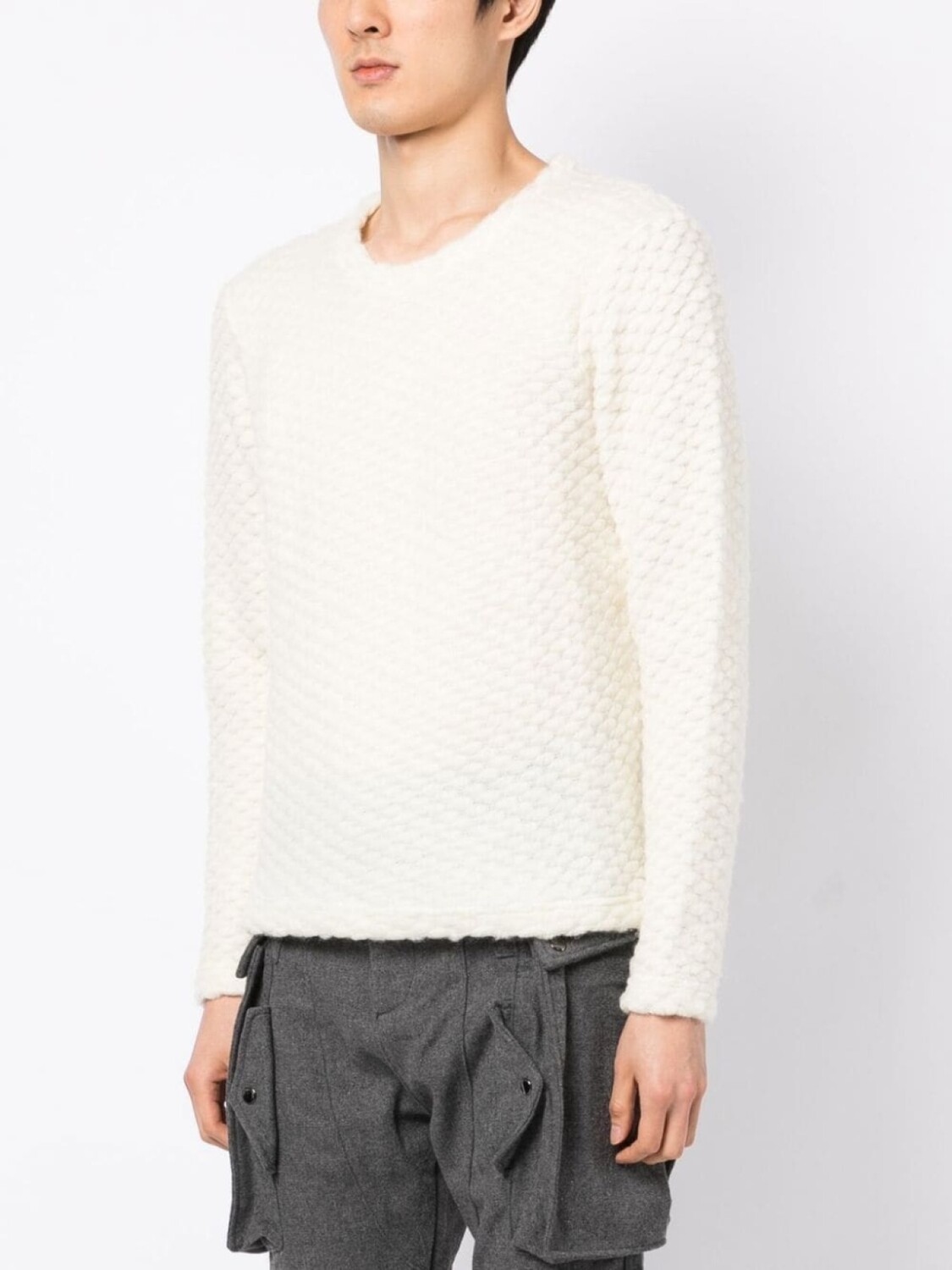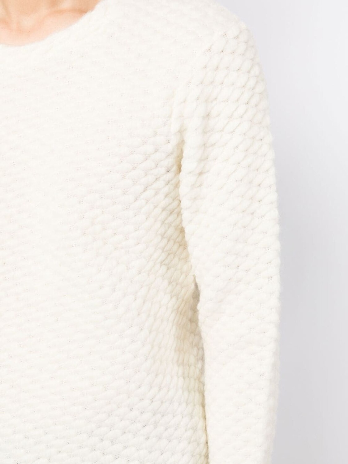 Кремово-белый, трикотажный материал, круглый вырез, длинные рукава и прямой подол.