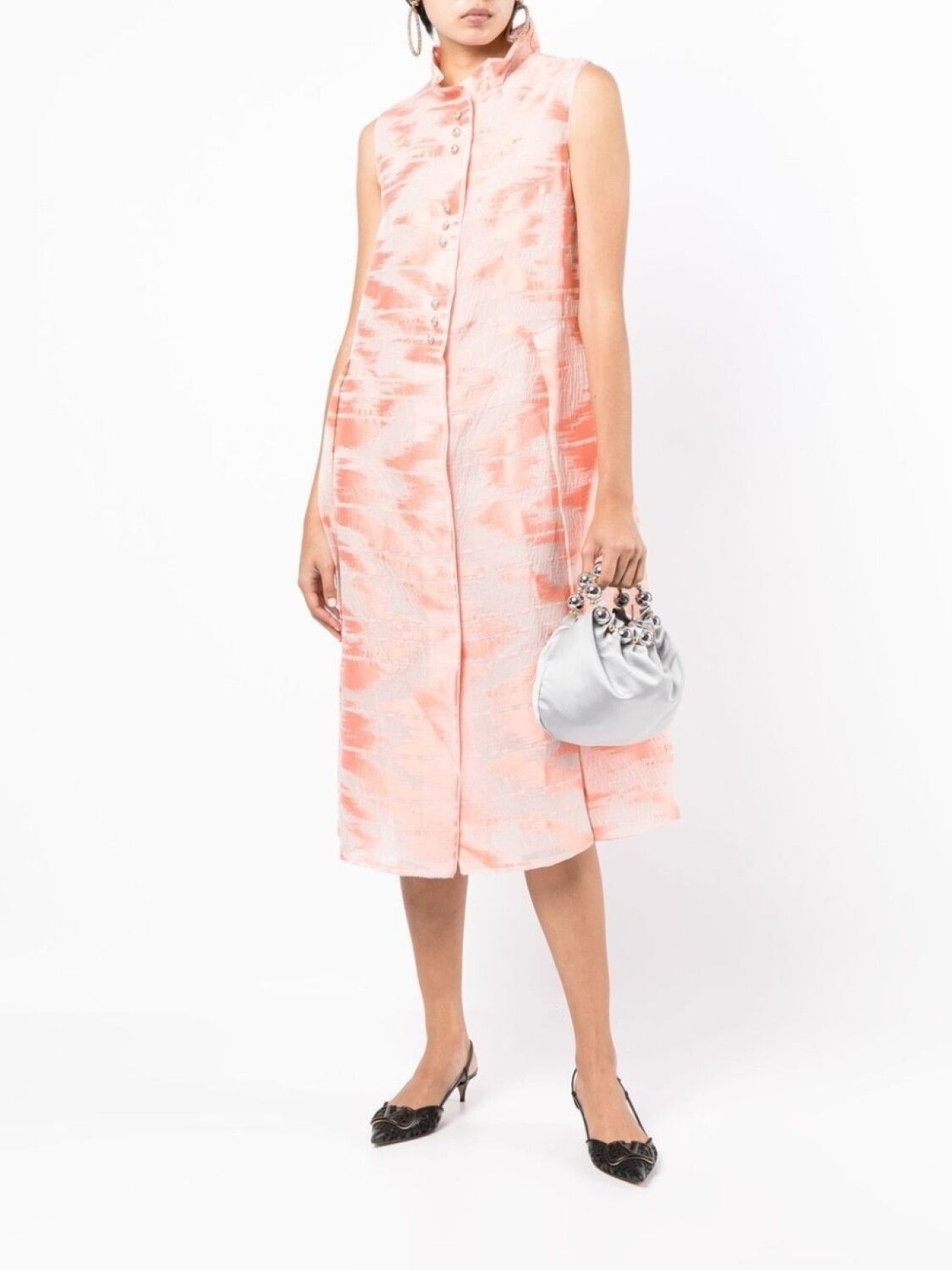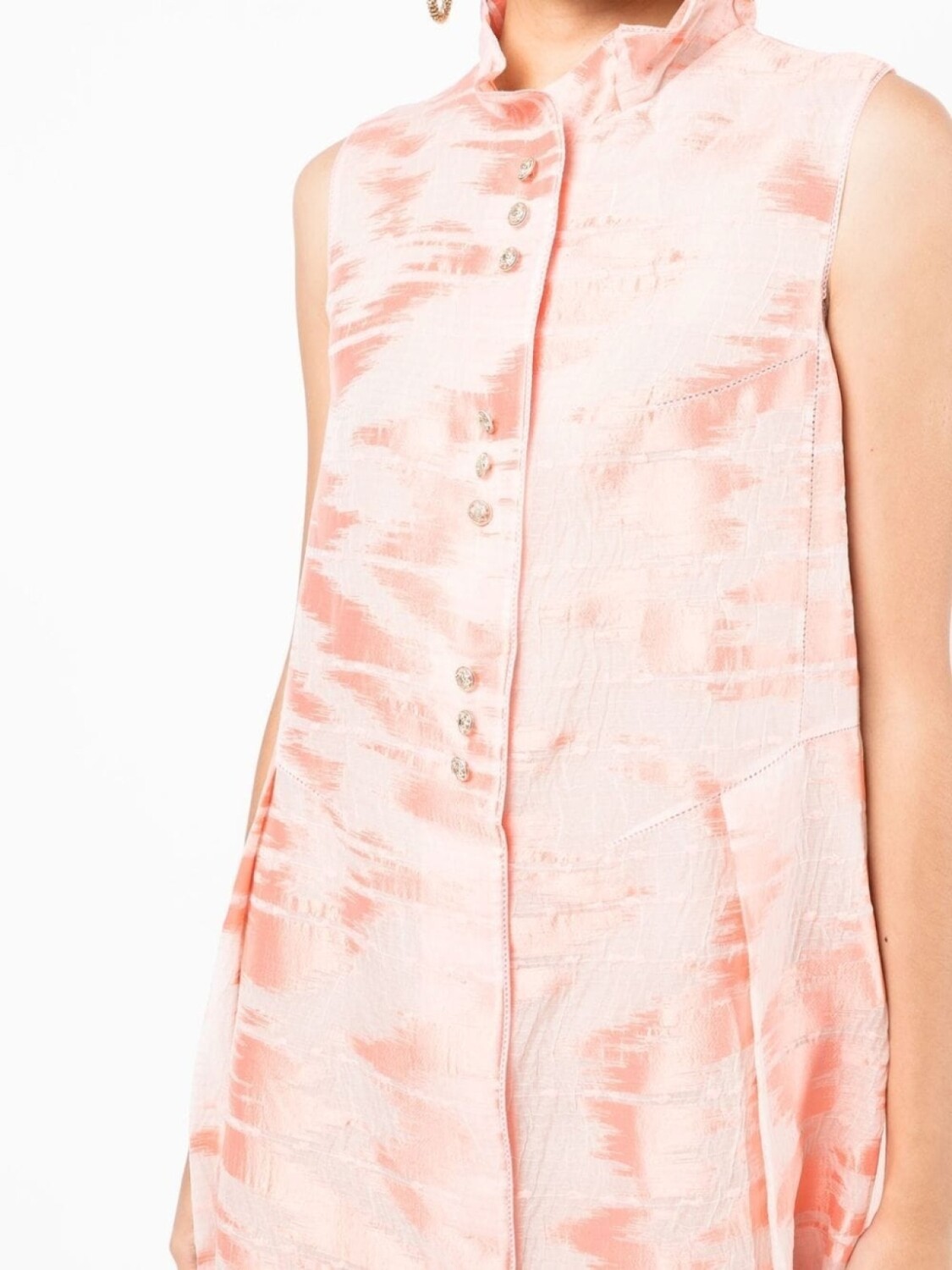 Расцветка Blush Pink, светло-розовый, шелк малбери, смесовый хлопок, матовый эффект, декоративные пуговицы, высокий присборенный воротник, застежка на пуговицах спереди, без рукавов, плиссированная юбка и расклешенная юбка.