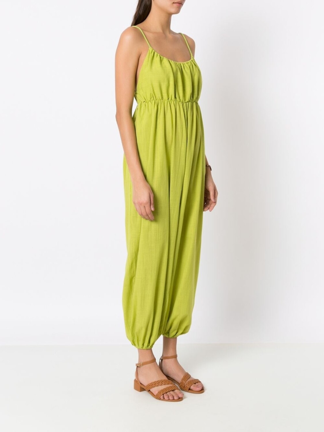 Тонкие бретели, U-образный вырез, ампирный силуэт, прямой крой и эластичные манжеты.