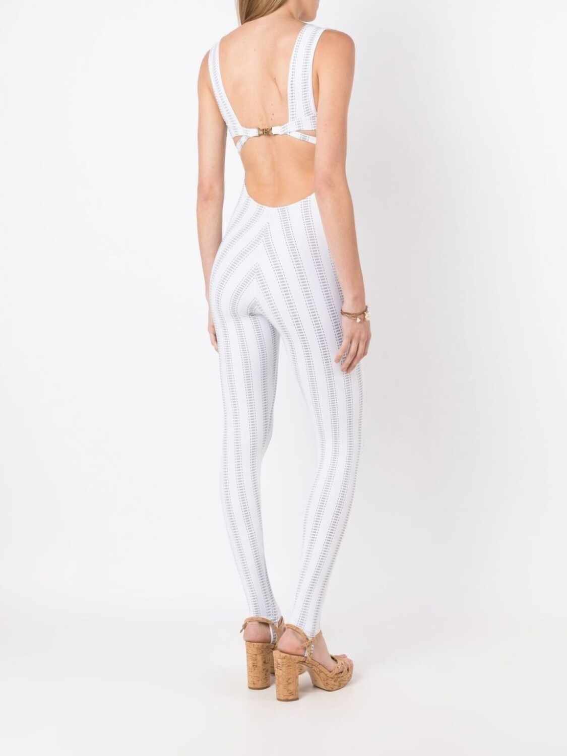 Белый/черный, эластичный материал, узор в вертикальную полоску, золотистая фурнитура, перекрученная деталь, вырезные детали, застежка на пряжке с логотипом, вырез в форме сердца, открытая спина, широкие бретели, застежка на зажиме сзади, узкий крой и высота по щиколотку.