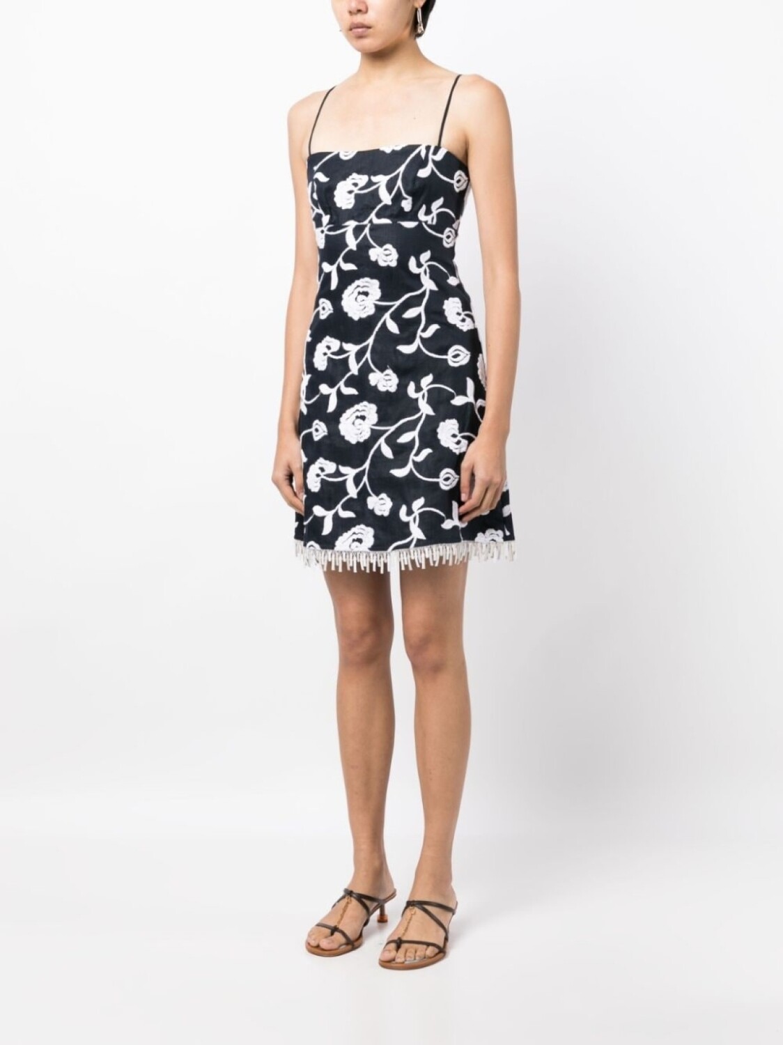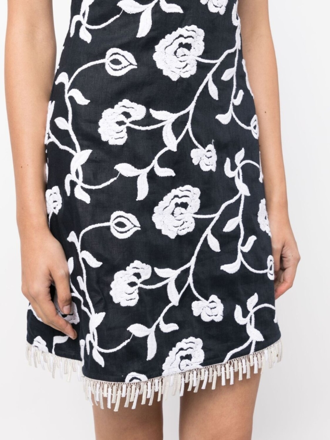 Темно-синий, белый, смесовый хлопок, сплошная цветочная вышивка, квадратный вырез, квадратный вырез на спине, потайная застежка на молнии сзади, тонкие бретели, без рукавов, края с бахромой и длина выше колена.