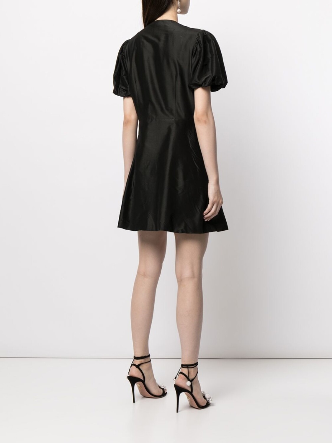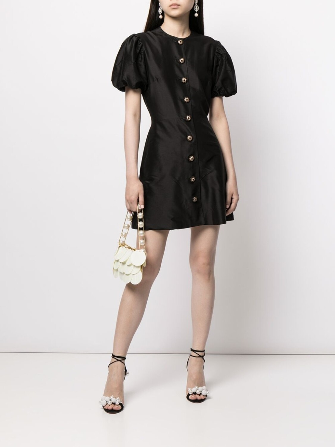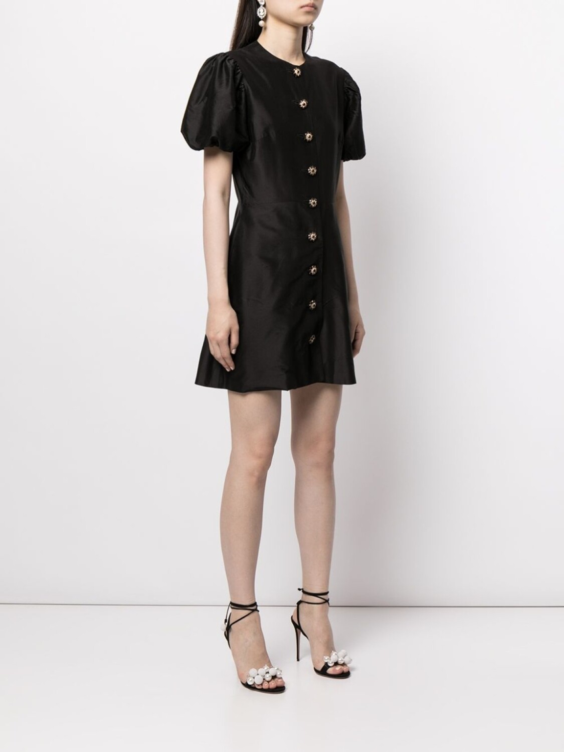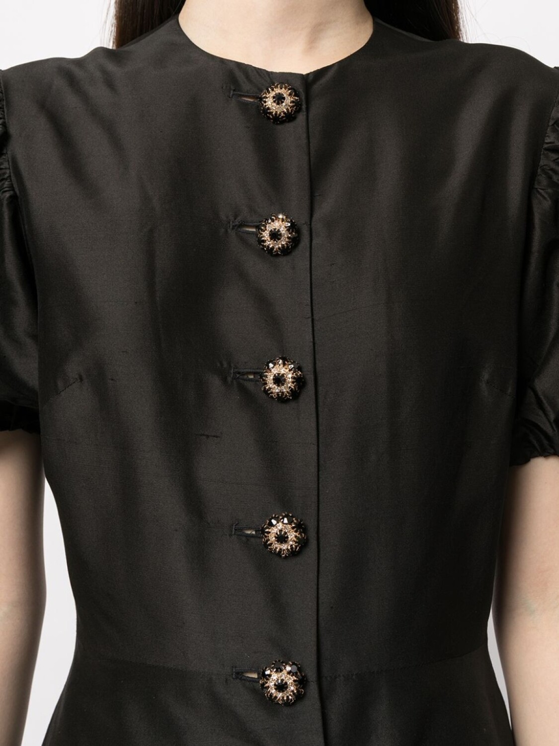 Круглый вырез, застежка на пуговицах спереди, короткие объемные рукава, юбка А-образного силуэта и длина до бедер. Цвет: черный.