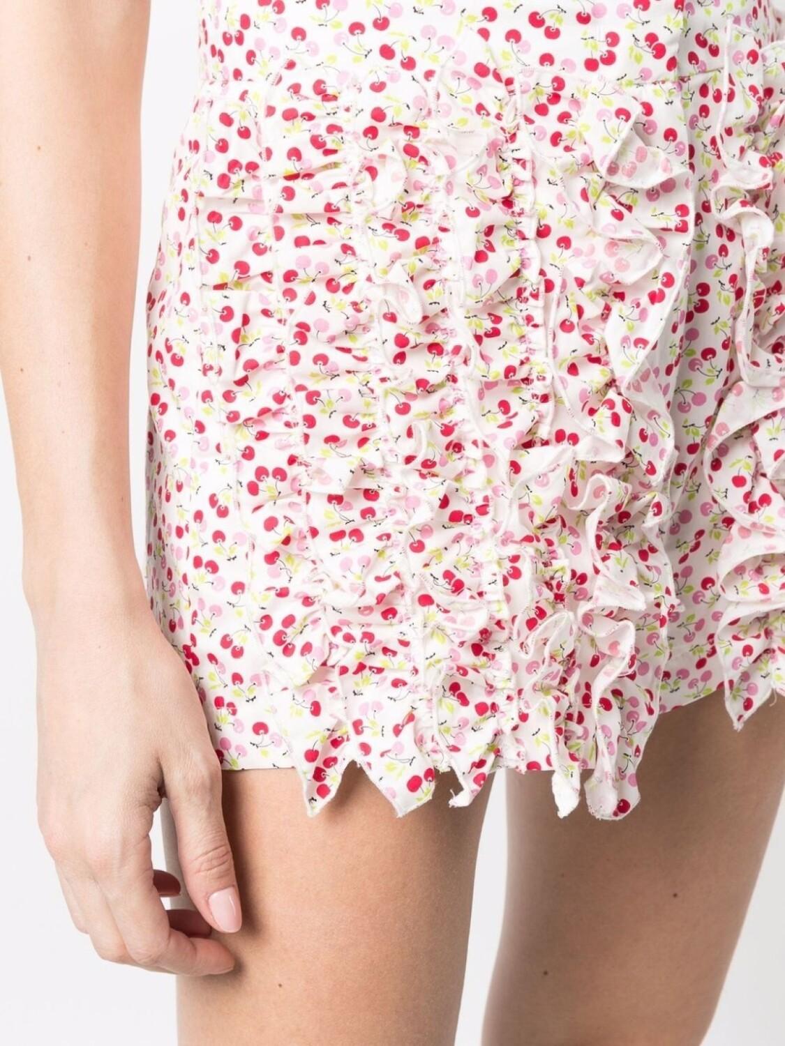 Знаковый принт Cherry, завышенная талия, вставки с оборками, потайная застежка спереди и длина до бедер.