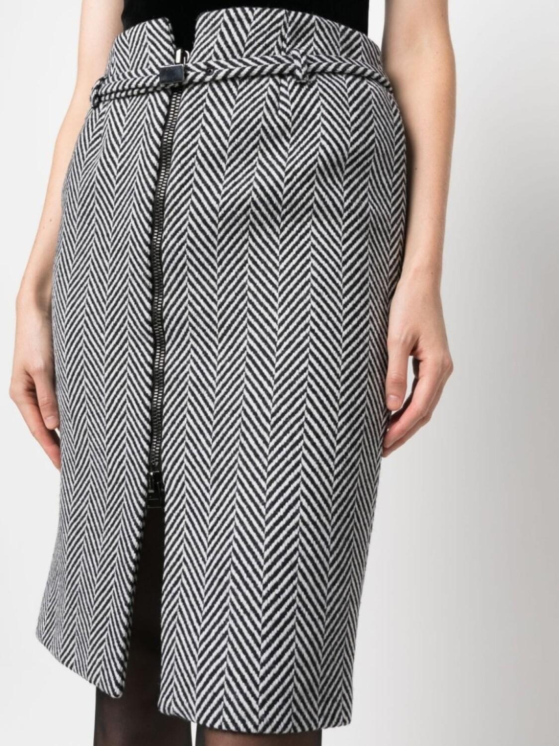 Черный/белый, смесовая необработанная шерсть, узор шеврон, ремень на талии, застежка на молнии спереди, юбка-карандаш и длина выше колена.