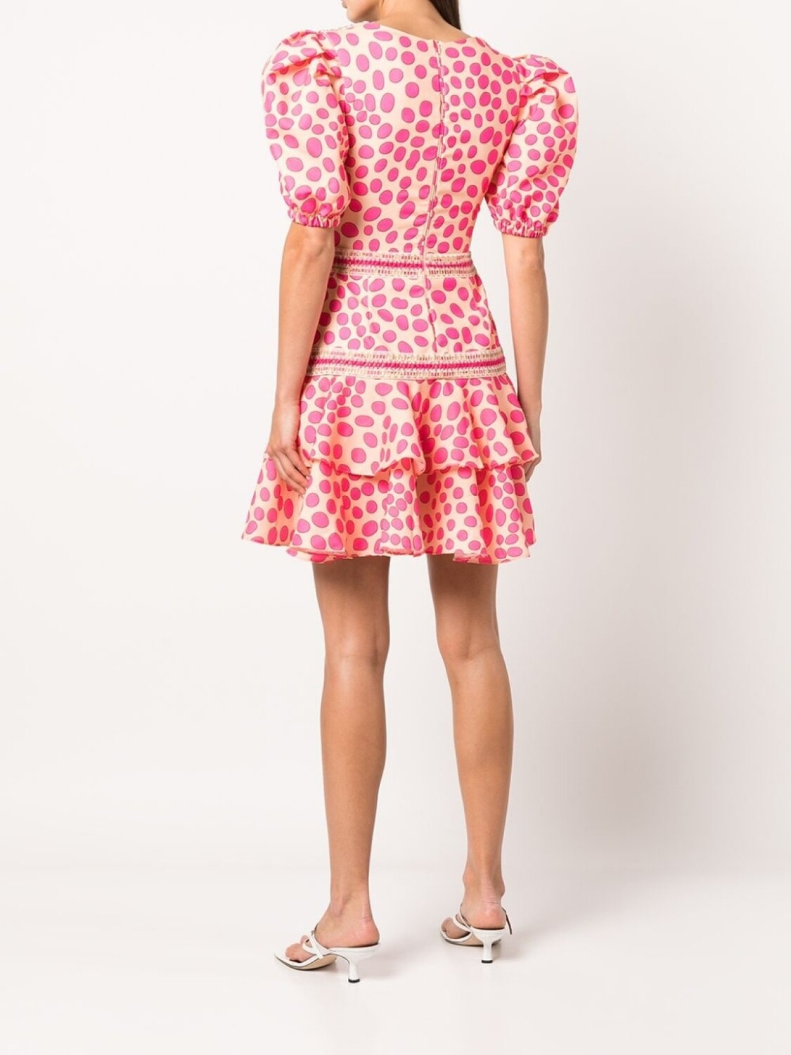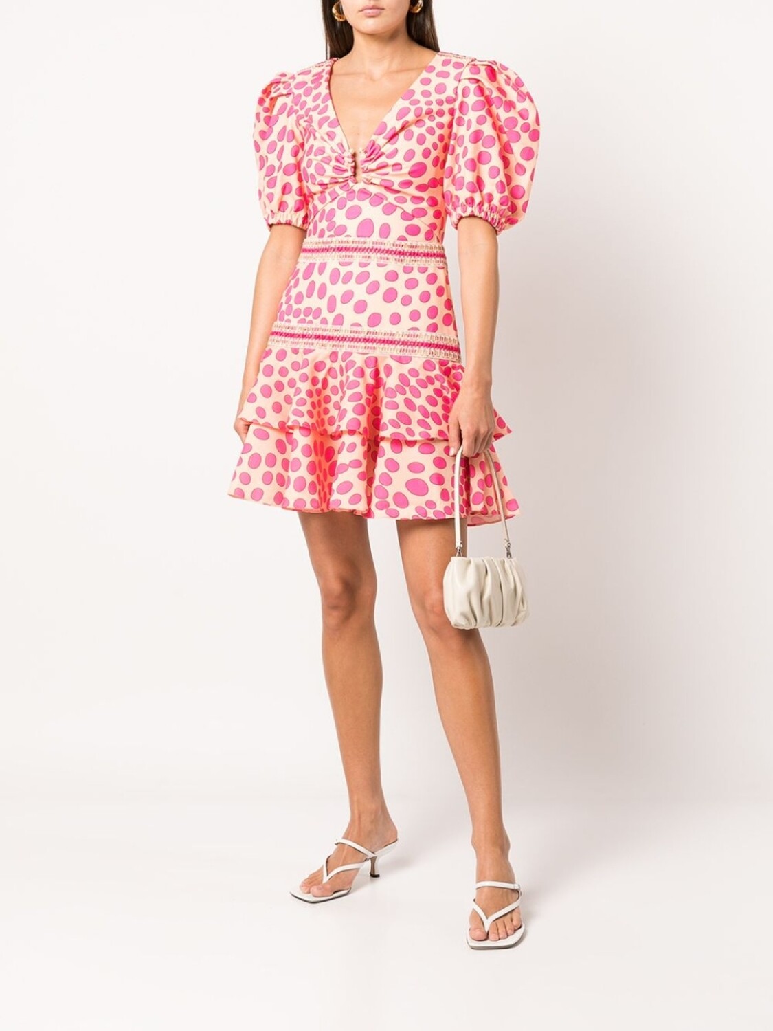 Принт в горох, кружевная отделка, перекрученная деталь, короткие объемные рукава, приталенный силуэт и отделка с оборками.