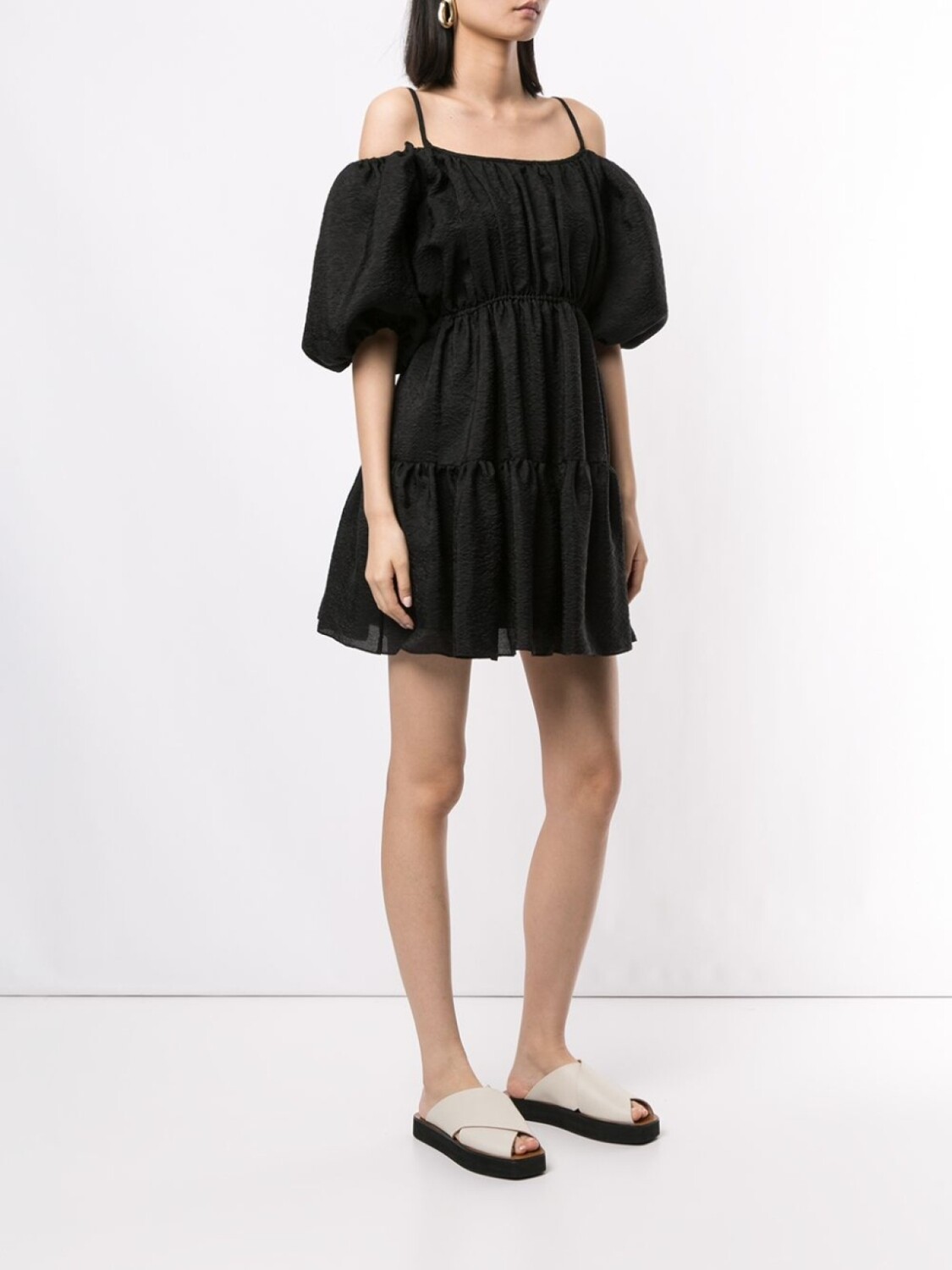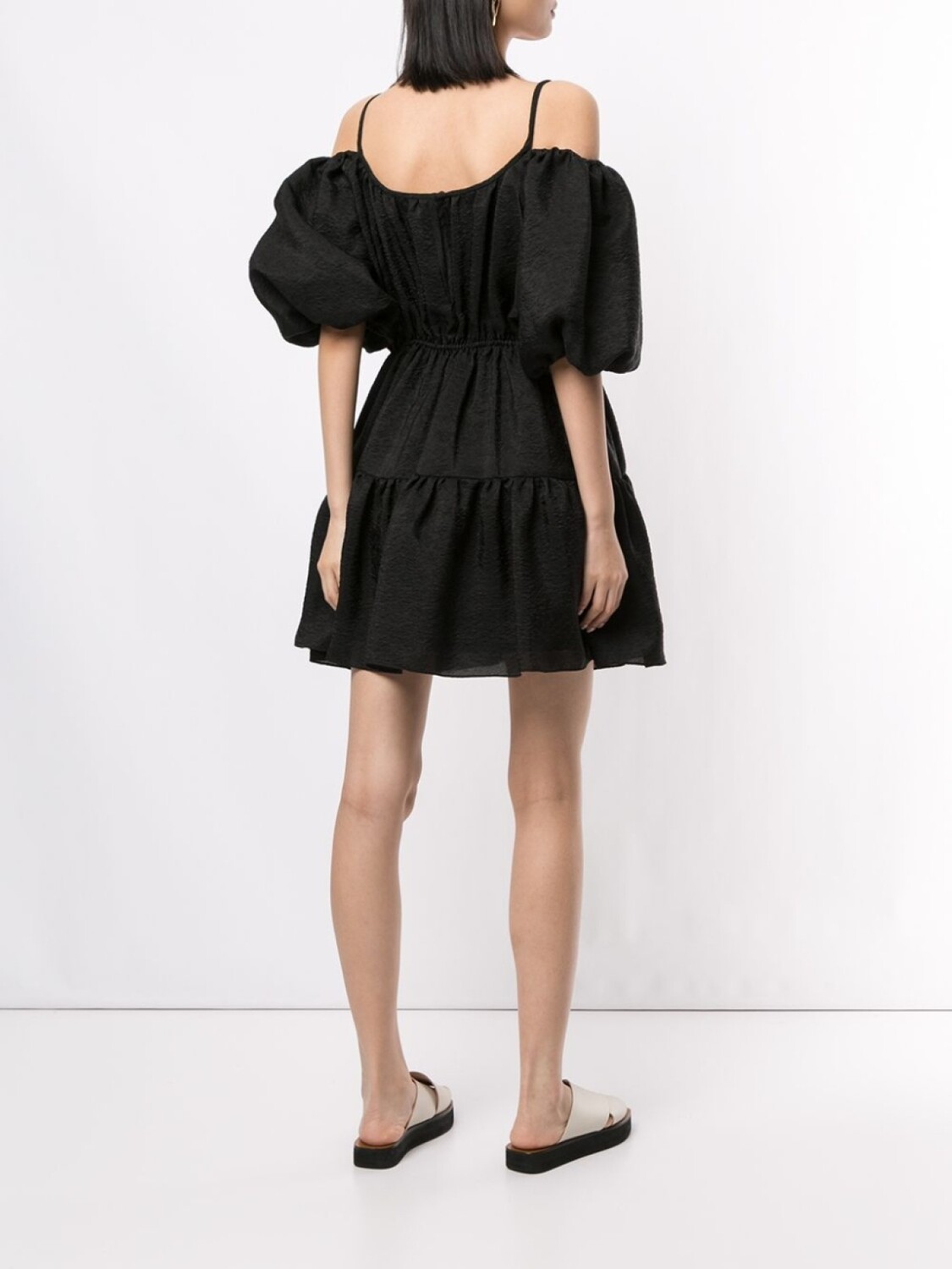 Платье мини с объемными рукавами от Goen.J. Модель со спущенными плечами, тонкие лямки-спагетти, потайная пуговичная застежка, многоуровневый дизайн и короткая длина. Цвет: черный.