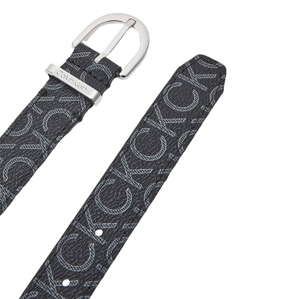 Ремень от бренда Calvin Klein черного цвета с логотипом-монограммой по всей поверхности и металлической киперой. Изготовлен на 50-70% из переработанных материалов.