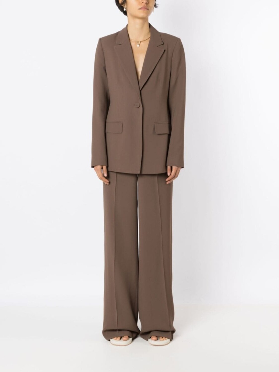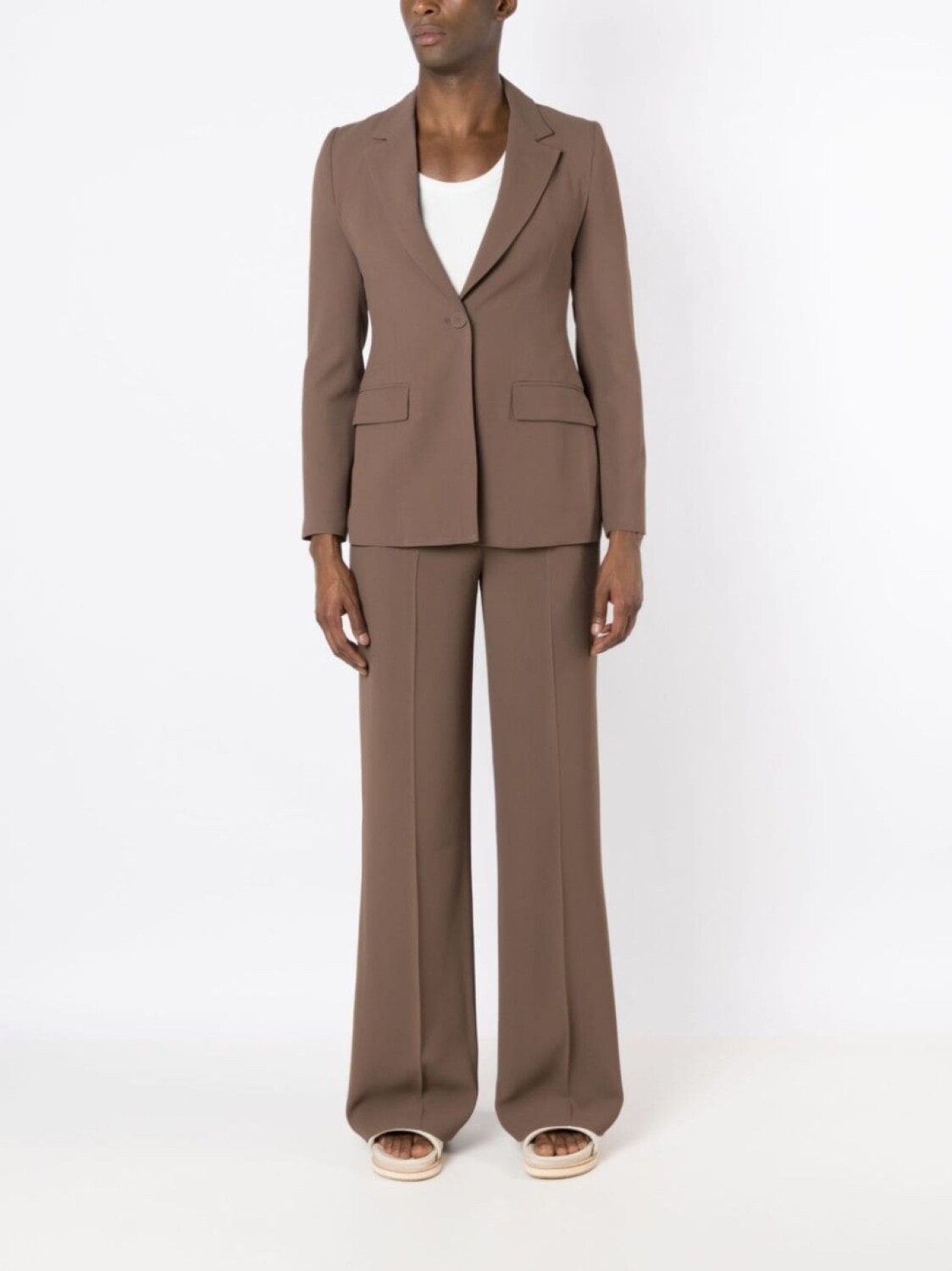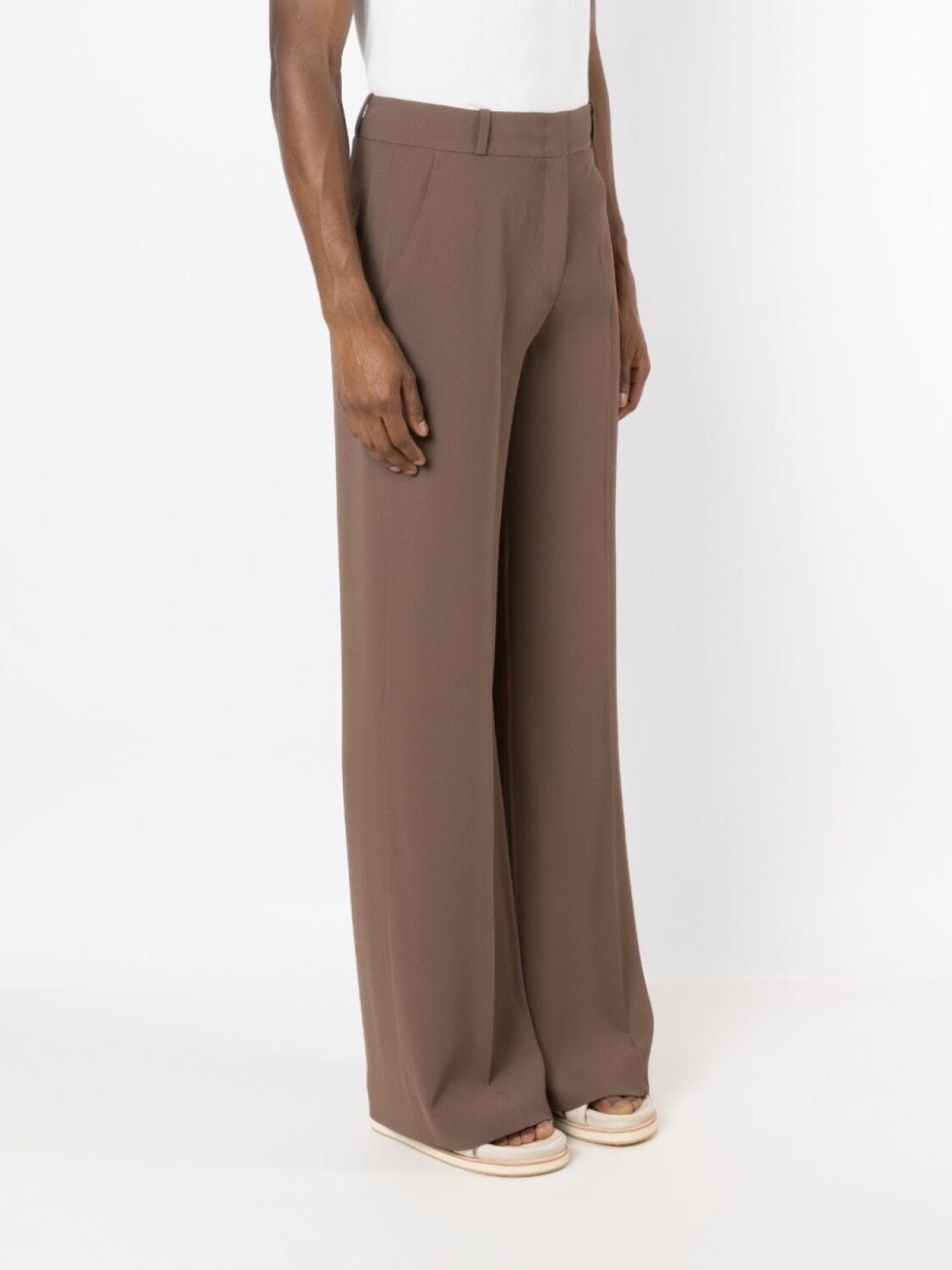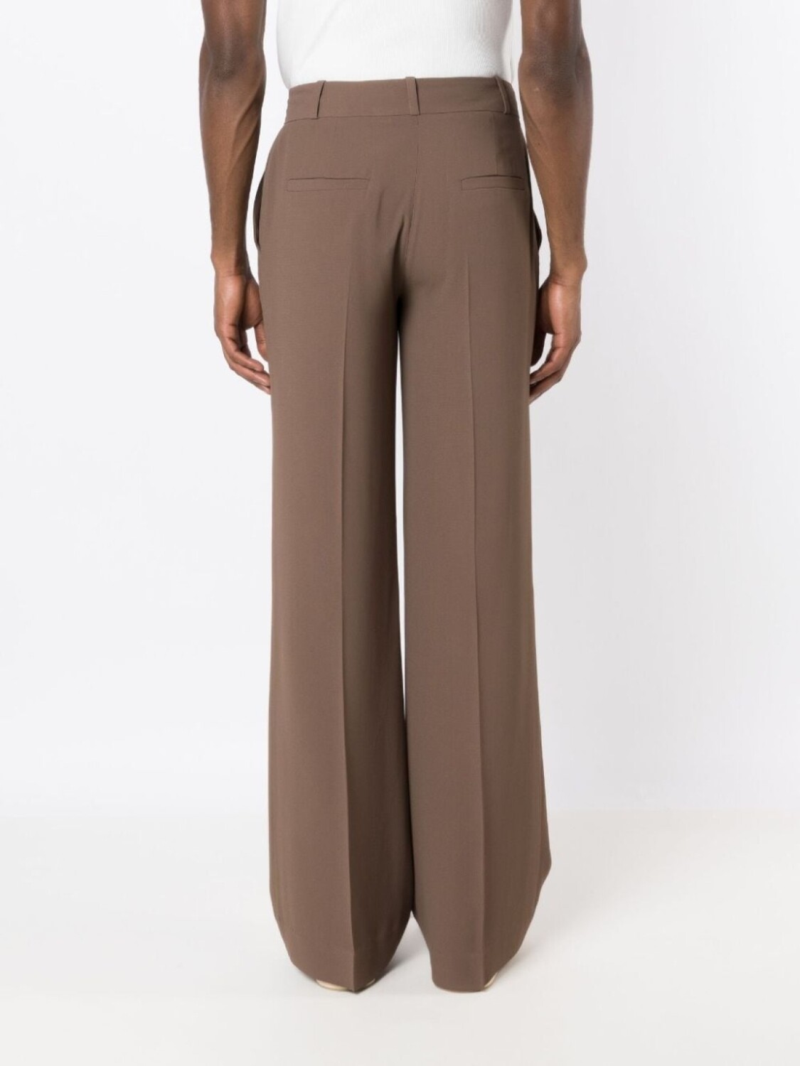 Коричневый, креповая текстура, классический крой, завышенная талия, петли для ремня, стрелки, потайная застежка спереди, широкий крой, два вшитых кармана по бокам и два кармана с листочкой сзади. Это унисекс-модель. Обратите внимание, что для нее используется мужская размерная сетка.