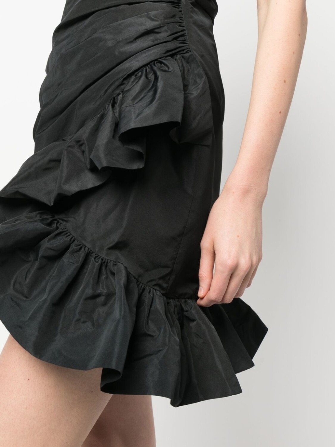 Черный, модель на запах, вставки с оборками, V-образный вырез, потайная застежка на молнии сзади и короткие объемные рукава.