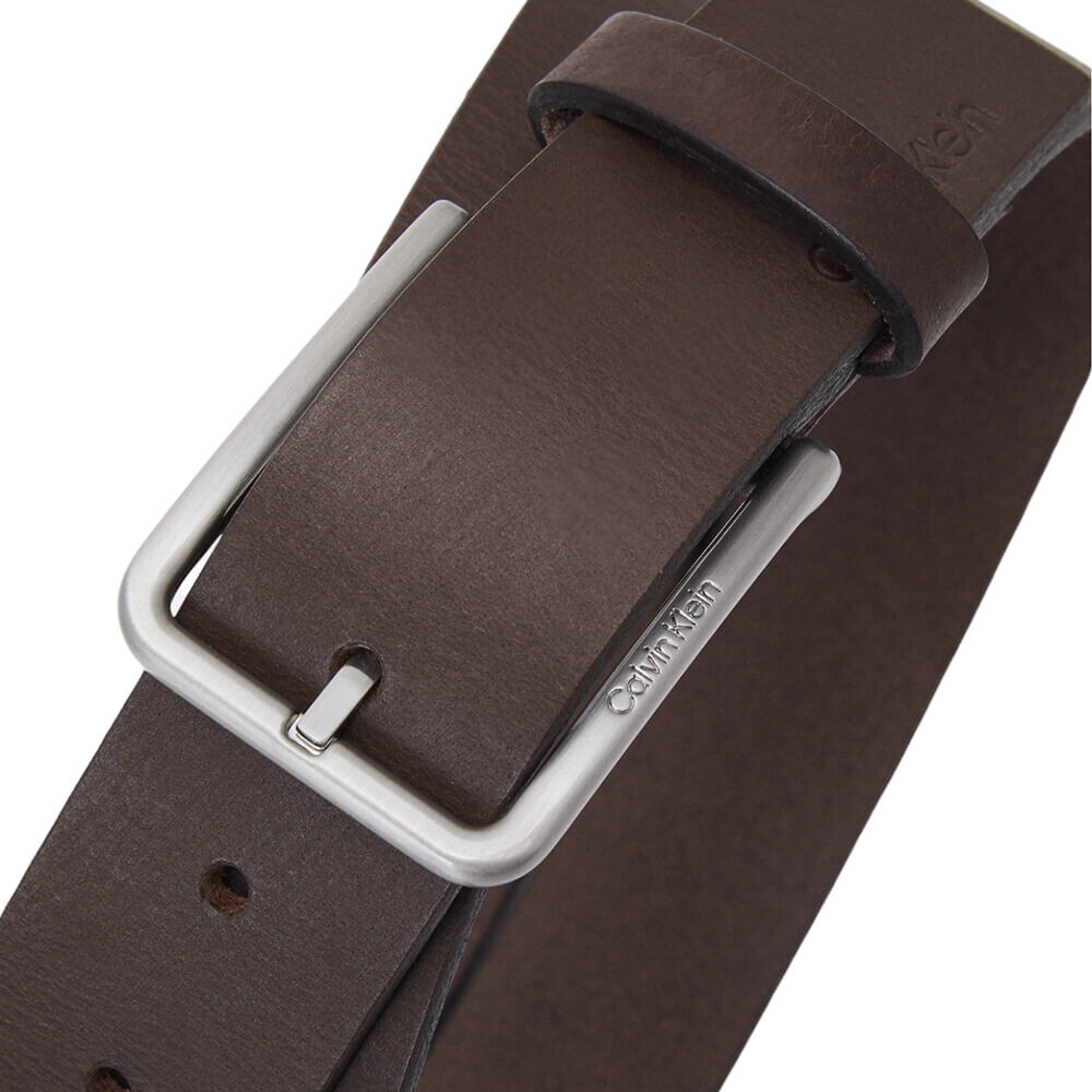 Ремень от бренда Calvin Klein темно-коричневого цвета из натуральной промасленной зернистой кожи, матовой металлической пряжкой и тисненым логотипом на ремне и пряжке.