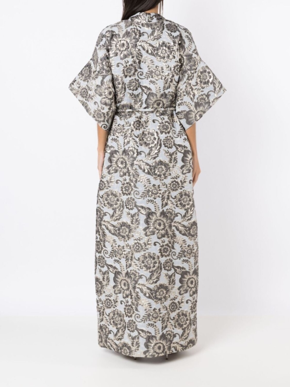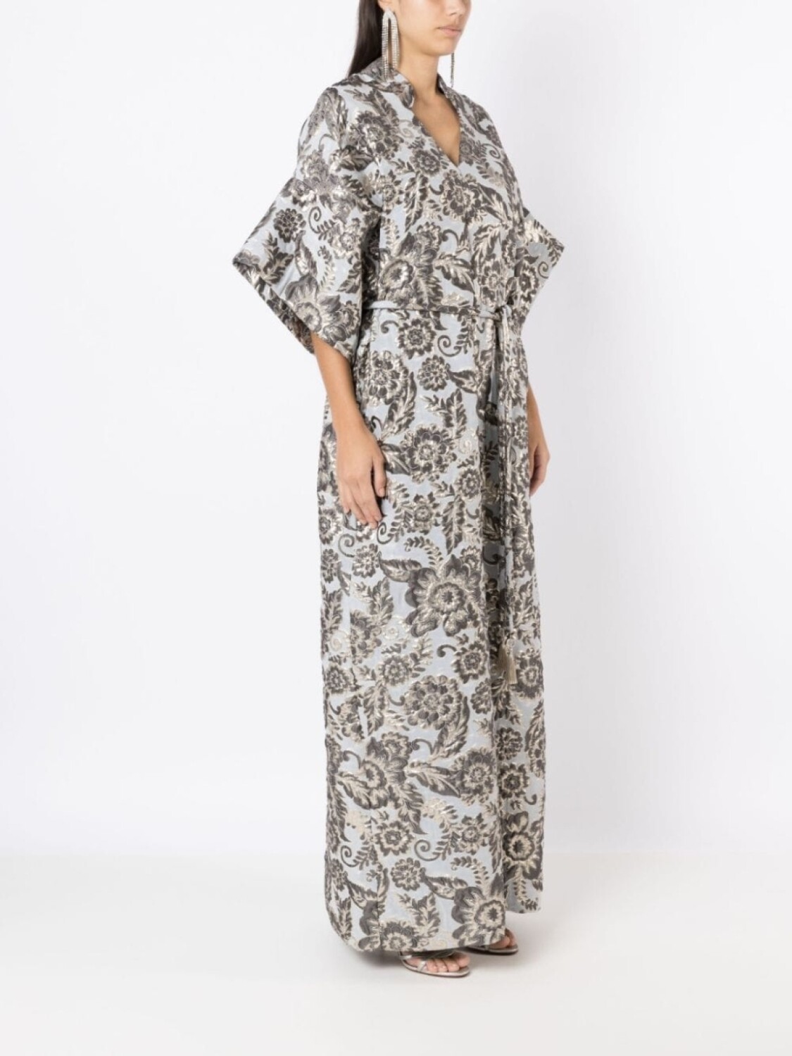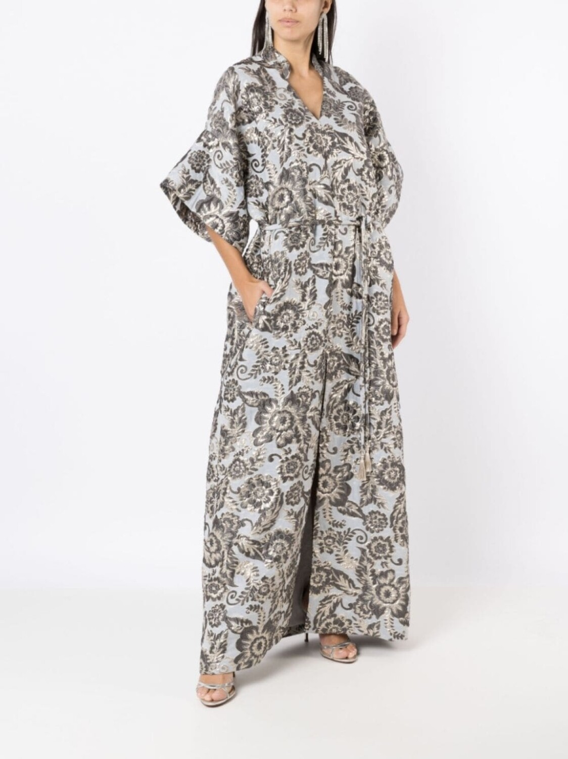 Серебристый, покрытие с эффектом металлик, цветочная вышивка, воротник-стойка, V-образный вырез, рукава три четверти, завязки спереди, юбка А-образного силуэта, два прорезных кармана по бокам, разрез спереди, прямой подол и длина макси.