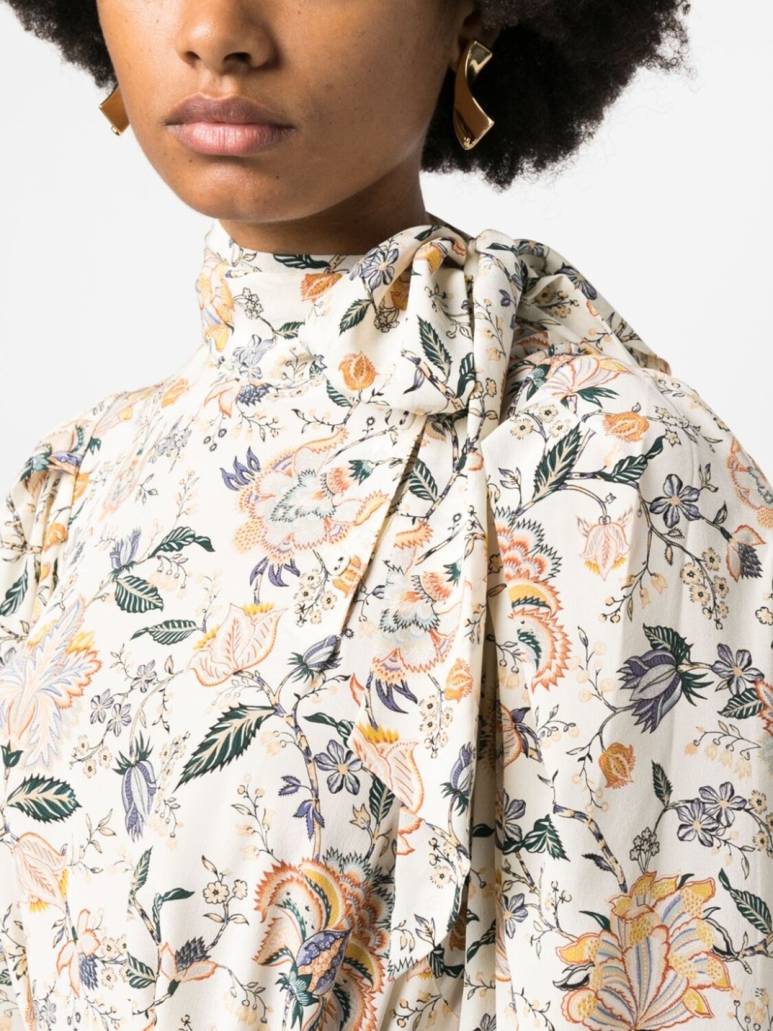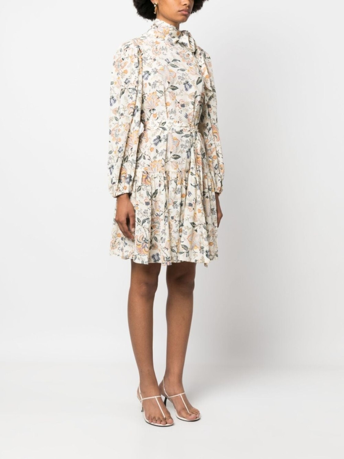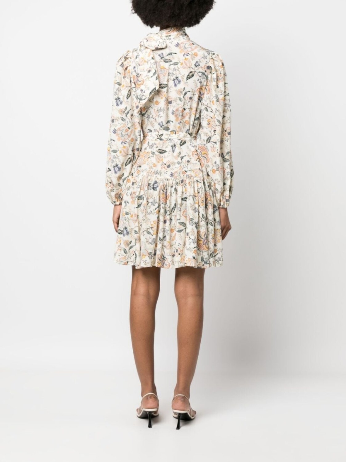 Белый/разноцветный, шелк, расклешенный крой, сплошной цветочный принт, завязка на бант сбоку, длинные рукава и прямой подол.