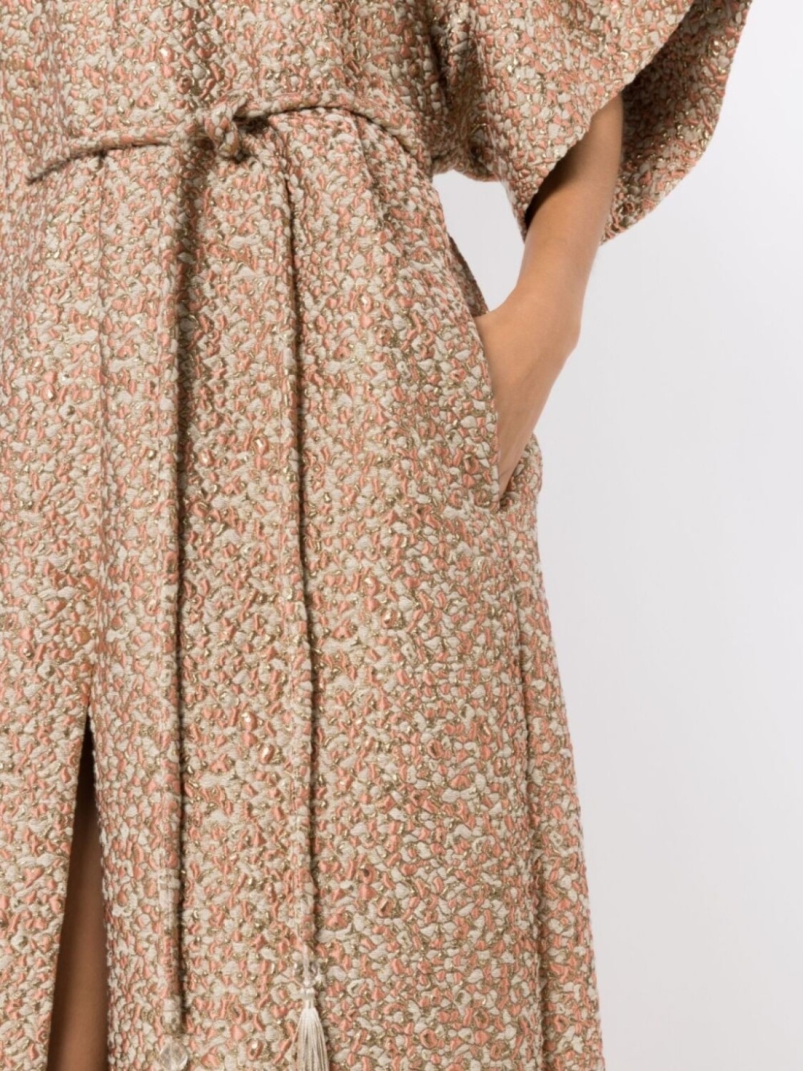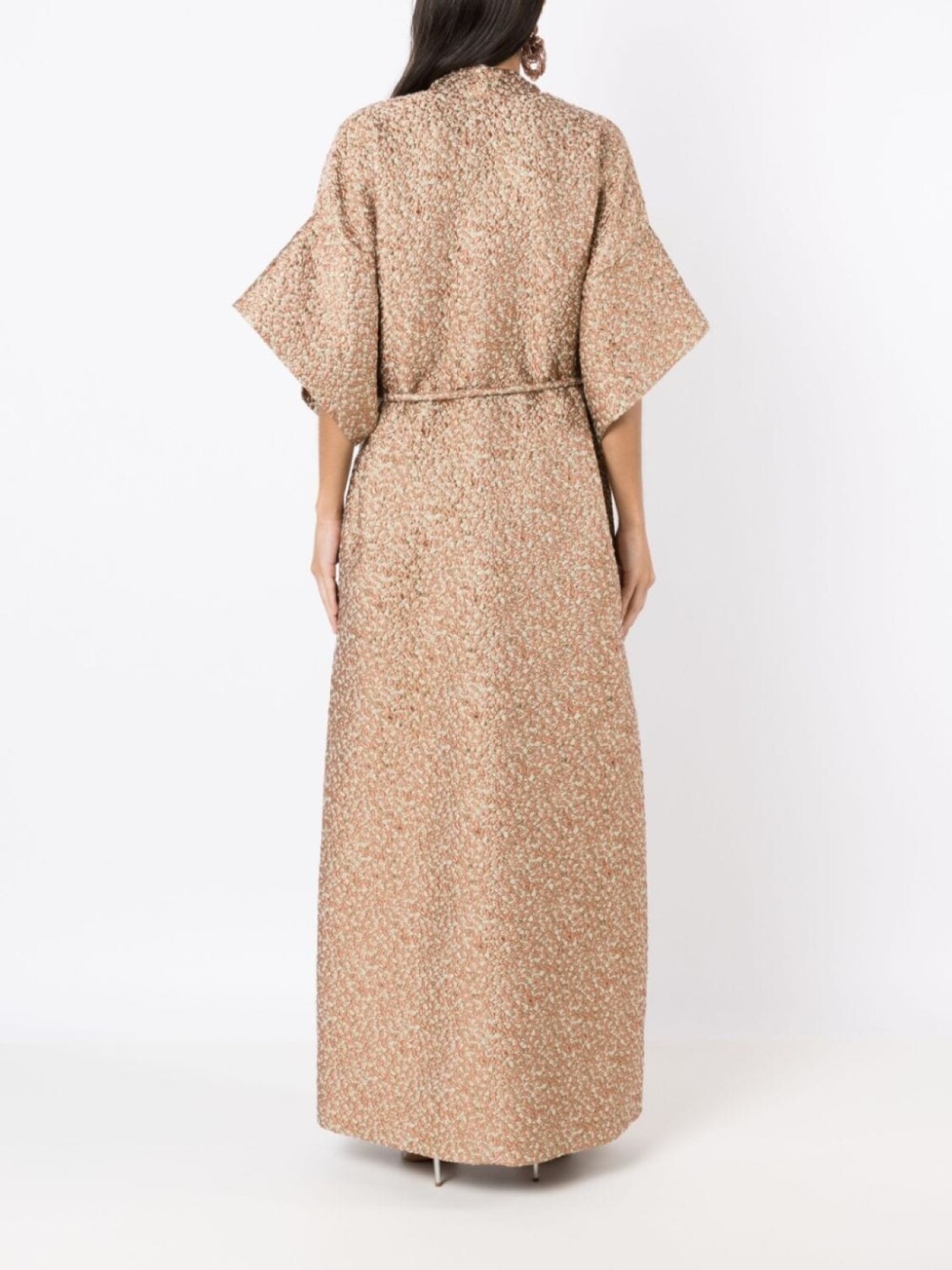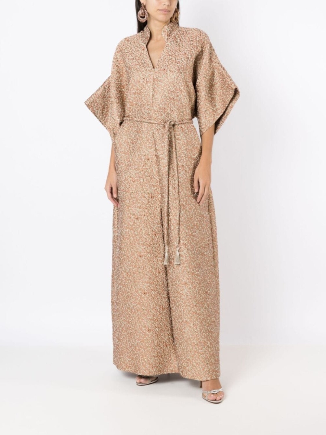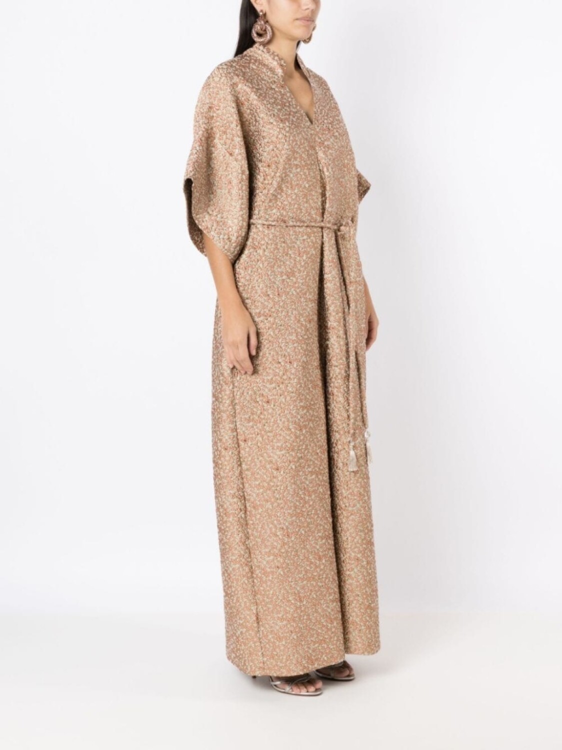 Коричневый, разноцветный, покрытие с эффектом металлик, воротник-стойка, V-образный вырез, рукава три четверти, завязки спереди, юбка А-образного силуэта, два прорезных кармана по бокам, разрез спереди, прямой подол и длина макси.