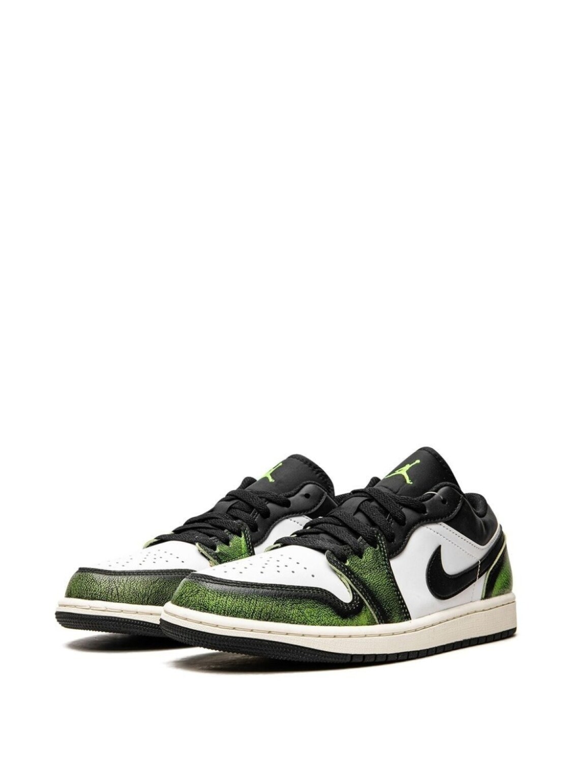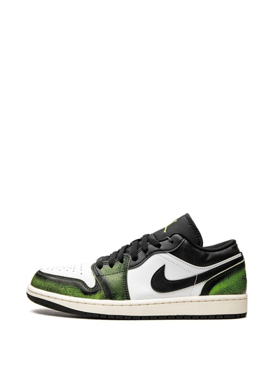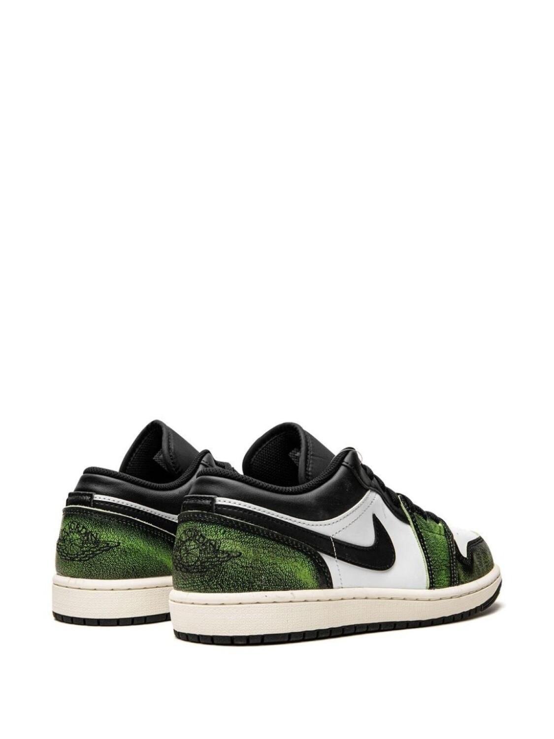 Черный, белый, светло-зеленый, кожа, логотип Nike Swoosh, логотип Air Jordan Wings, логотип Jumpman, закругленный носок, шнуровка спереди, стелька с логотипом и резиновая подошва. Эта модель представлена на маркетплейсе, где можно найти самые редкие модели кроссовок, о которых мечтают коллекционеры и любители streetwear по всему миру.