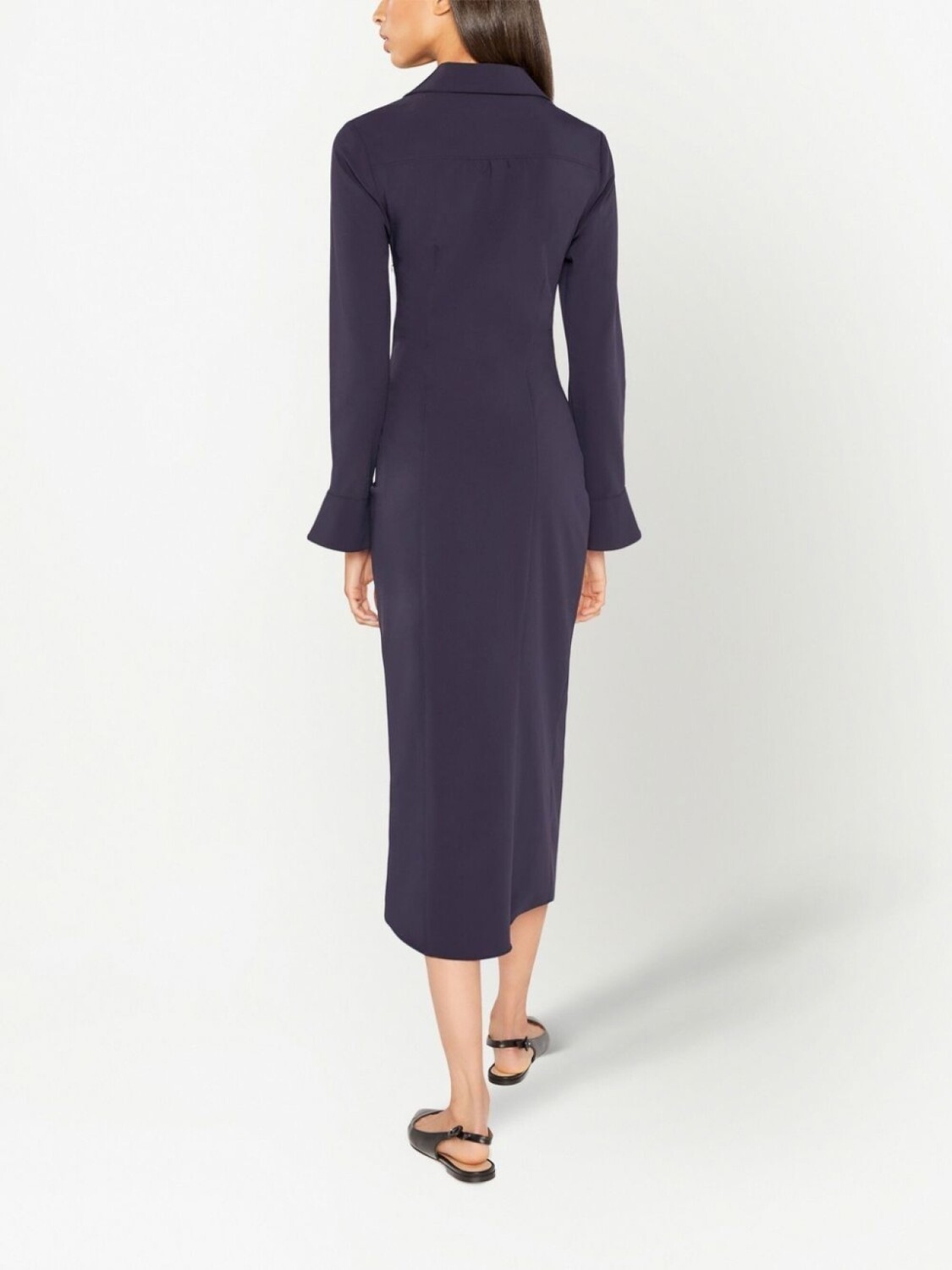 Темно-синий, детали с оборками, классический воротник, длинные рукава и длина макси.