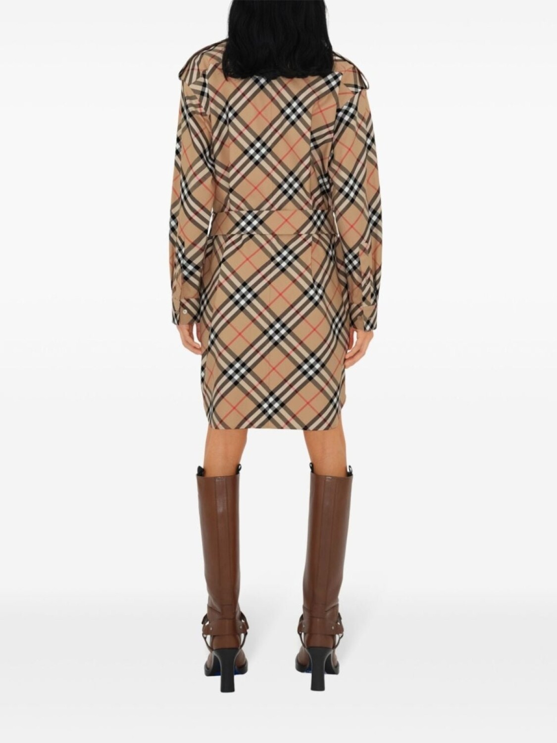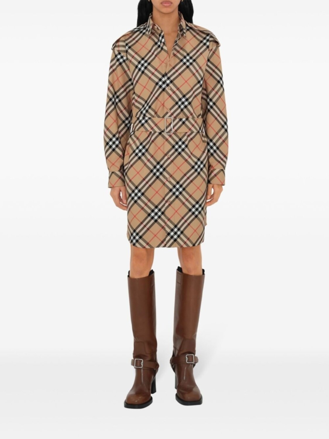 Песочно-коричневый/серый, хлопок, клетчатый принт Vintage Check, классический воротник, длинные рукава, манжеты на пуговицах, застежка на пуговицах спереди, ремень с пряжкой B, серебристый металлический логотип, закругленный подол