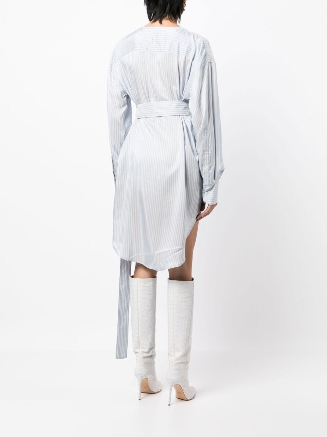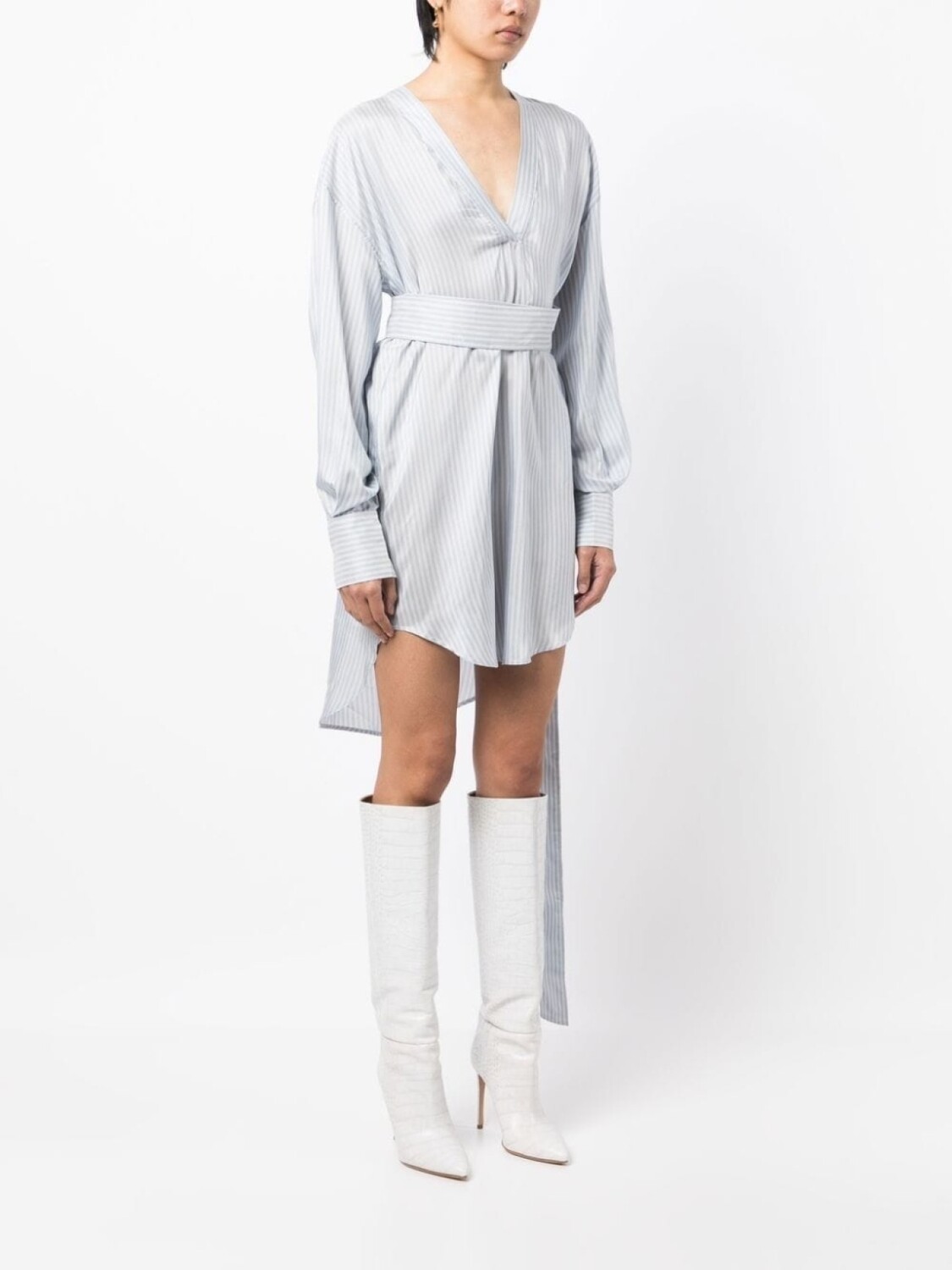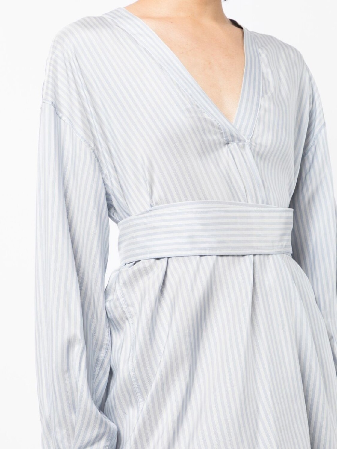 Синий/белый, шелк, узор в тонкую полоску, асимметричная форма, кулиска на талии, застежка на пряжке с двумя кольцами, V-образный вырез, длинные рукава, манжеты на пуговицах и закругленный подол.