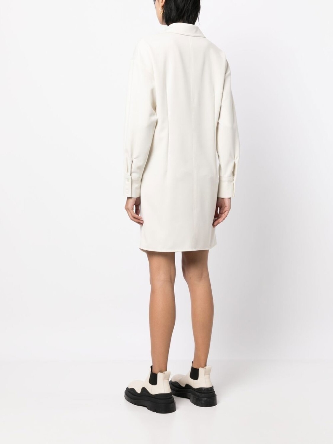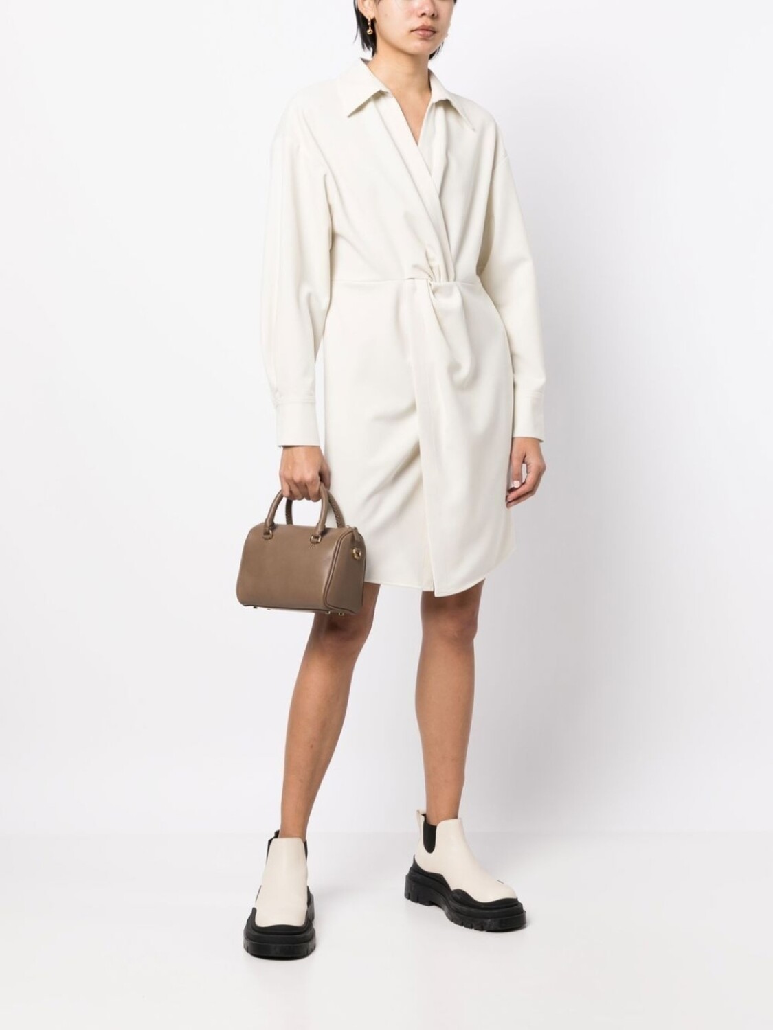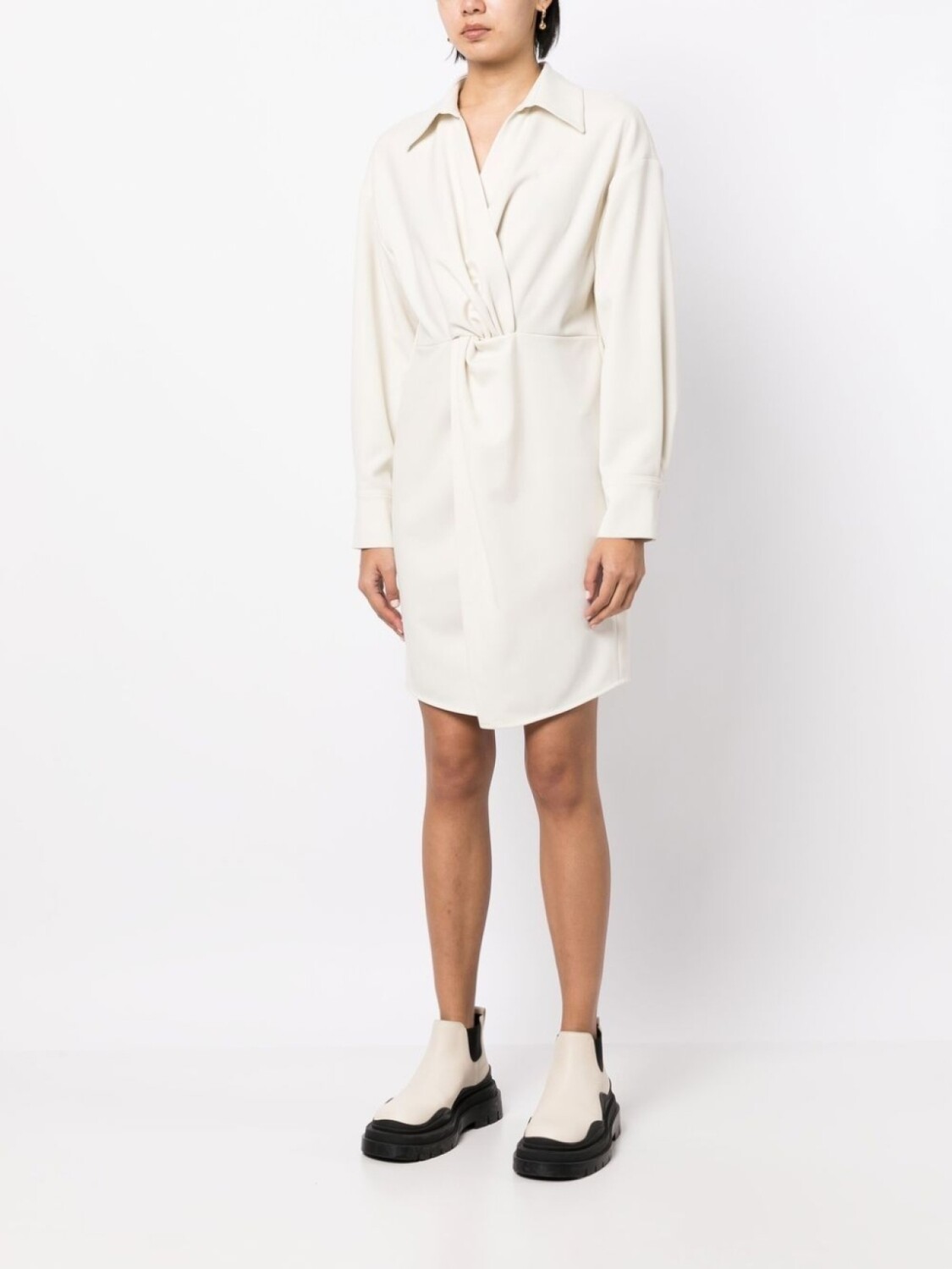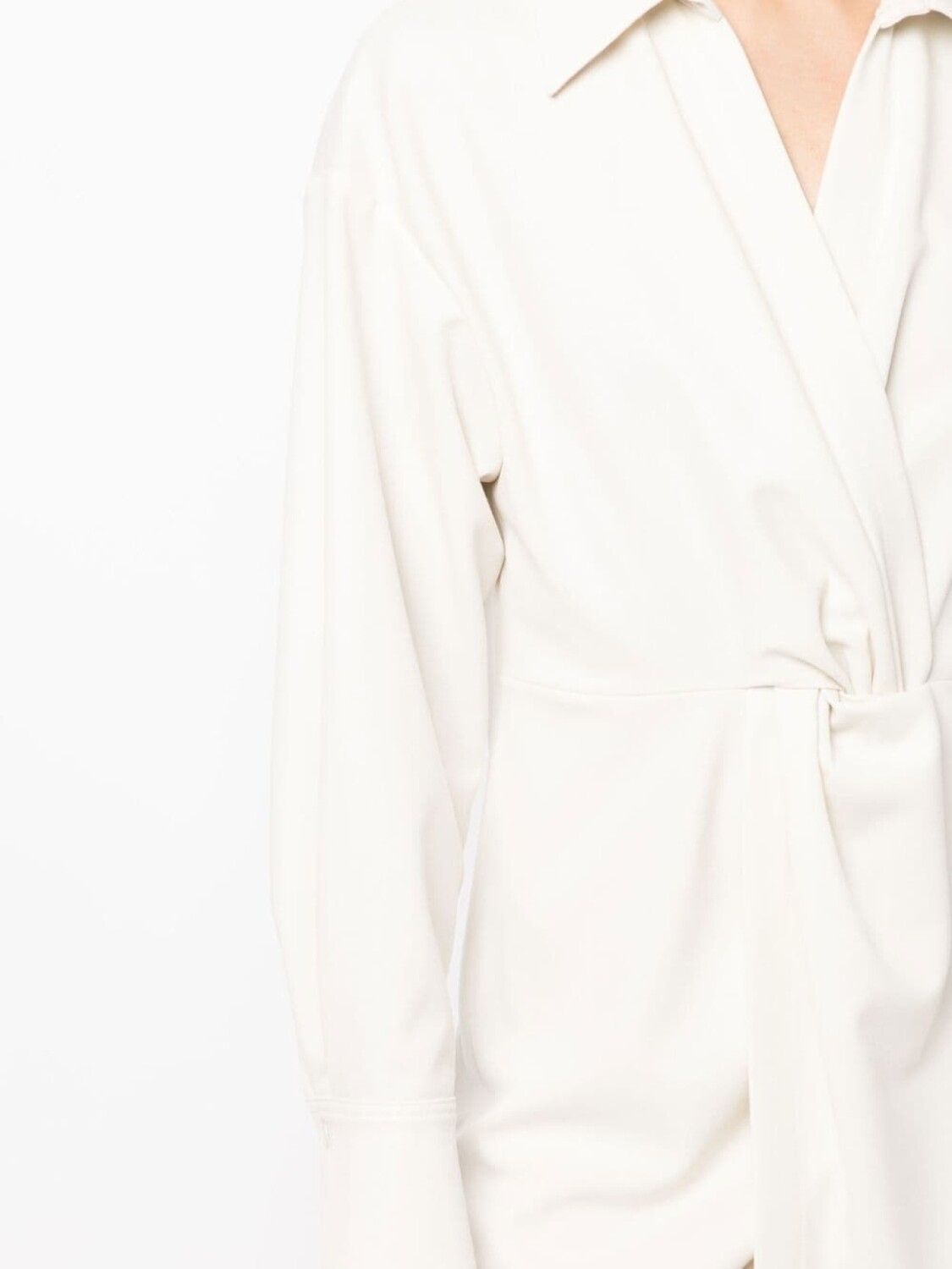 Кремово-белый, перекрученная деталь, классический воротник, V-образный вырез, длинные рукава, манжеты на пуговицах и закругленный подол.