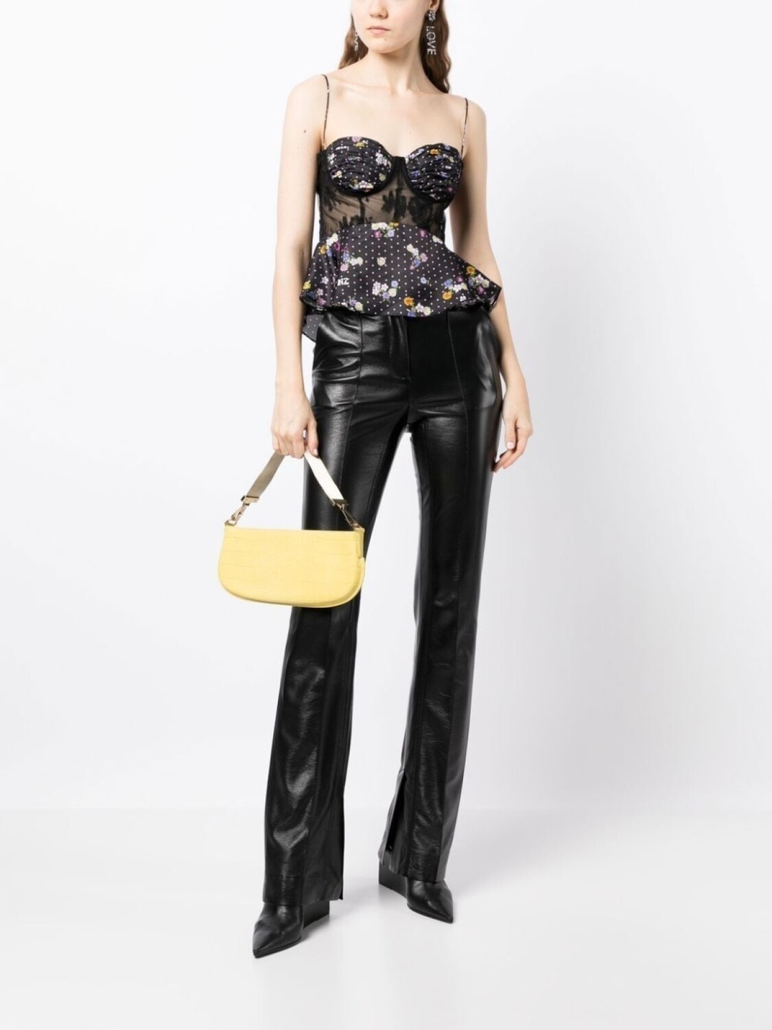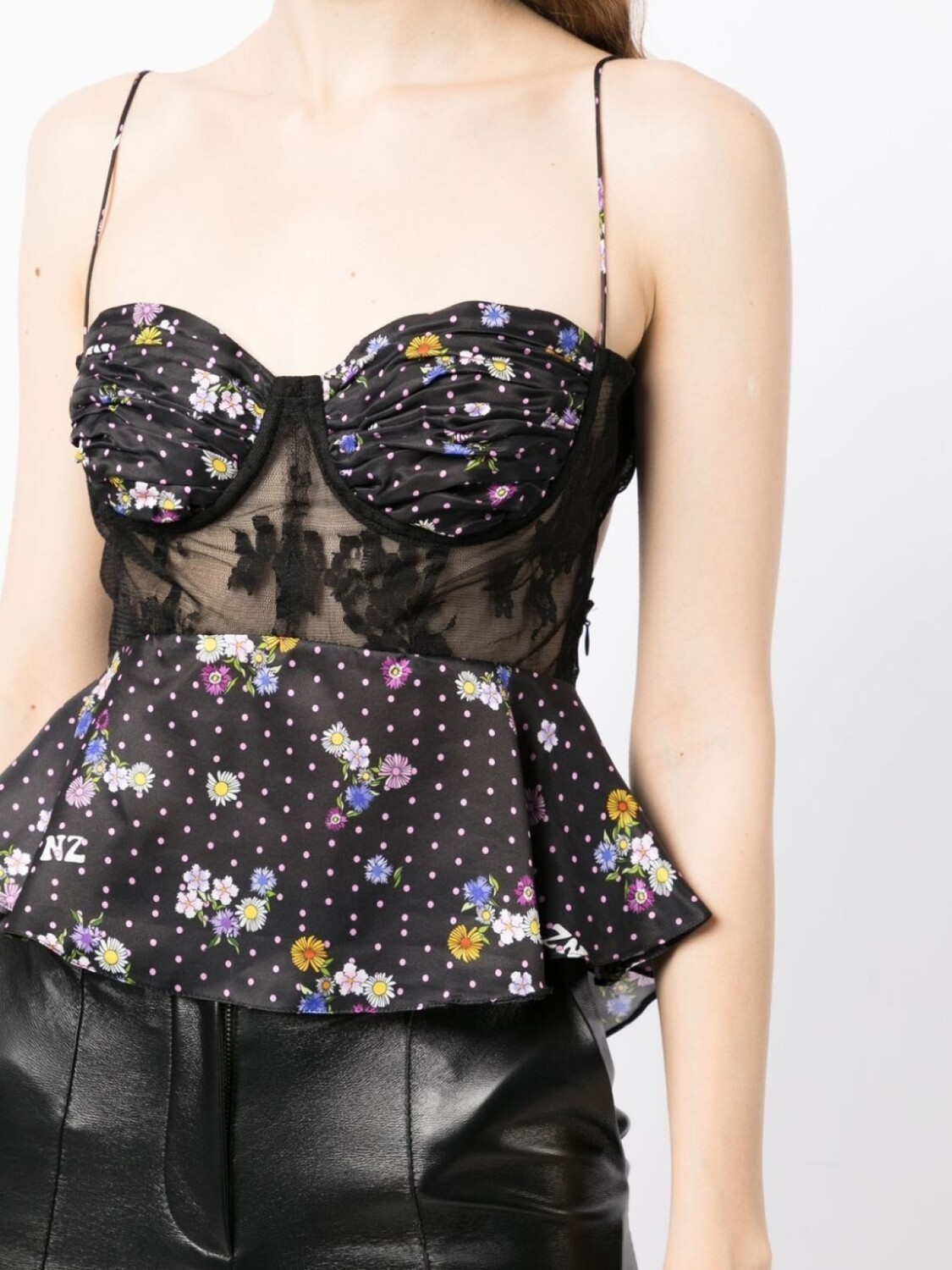 Черный, смесовый шелк, ткань с сатиновым переплетением, прозрачные кружевные вставки, детали с оборками, принт в горох, цветочный принт, вставки, вырез в форме сердца, застежка на завязке сзади, регулируемые тонкие бретели и подол с баской.