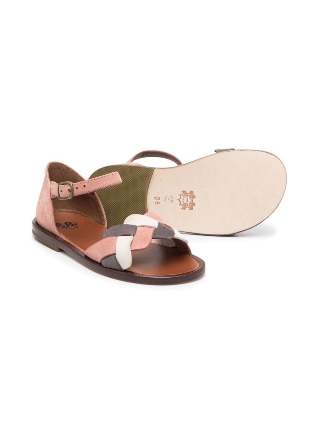 Разноцветный, телячья кожа, плетеный ремень, открытый носок, ремешок на щиколотке с пряжкой и плоская резиновая подошва.
