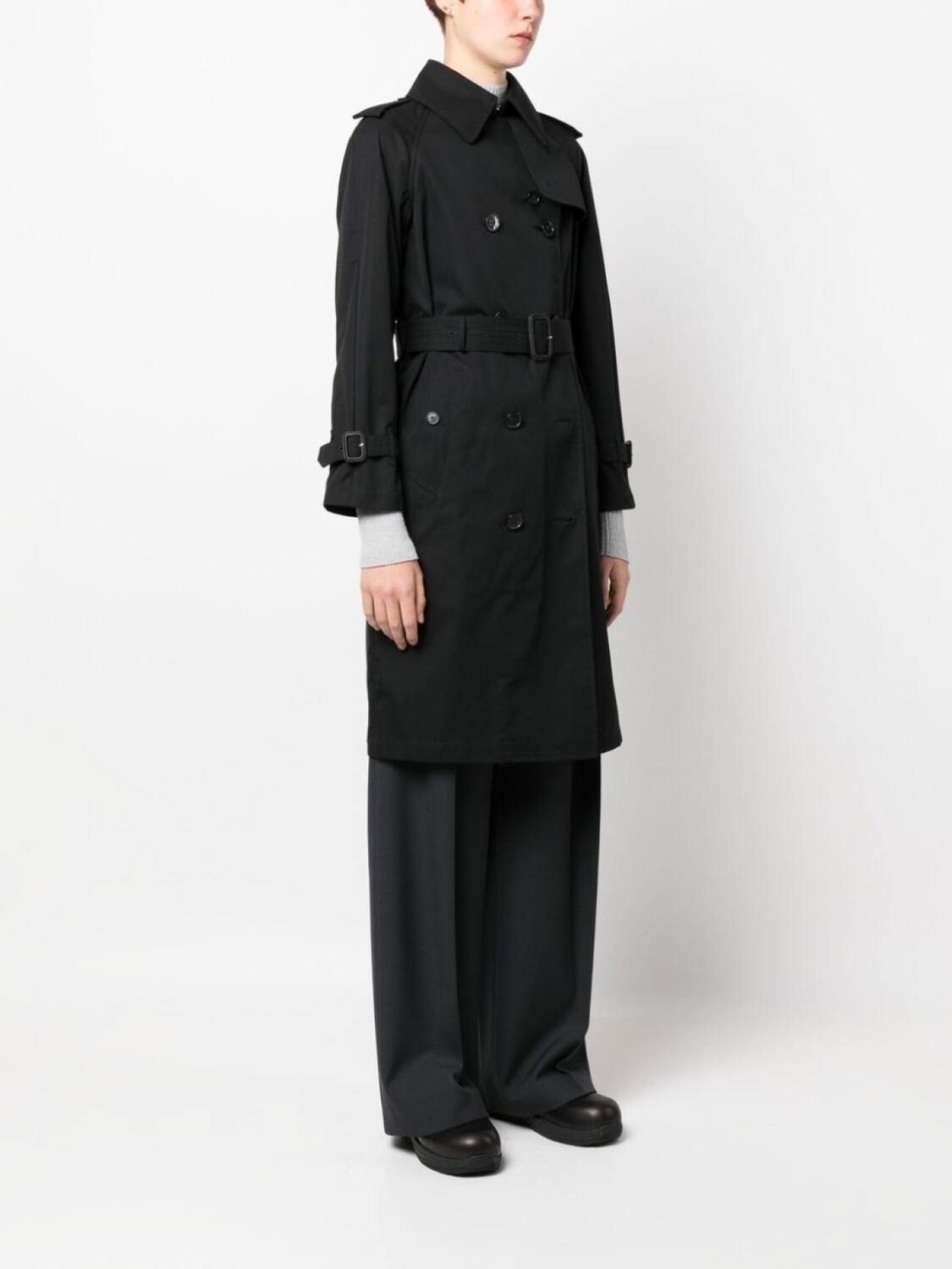 Черный, хлопок, двубортная застежка на кнопки, ремень на талии, штормовая заслонка, манжеты с ремешками, два прорезных кармана сбоку, длинные рукава, прямой подол и длина по колено.