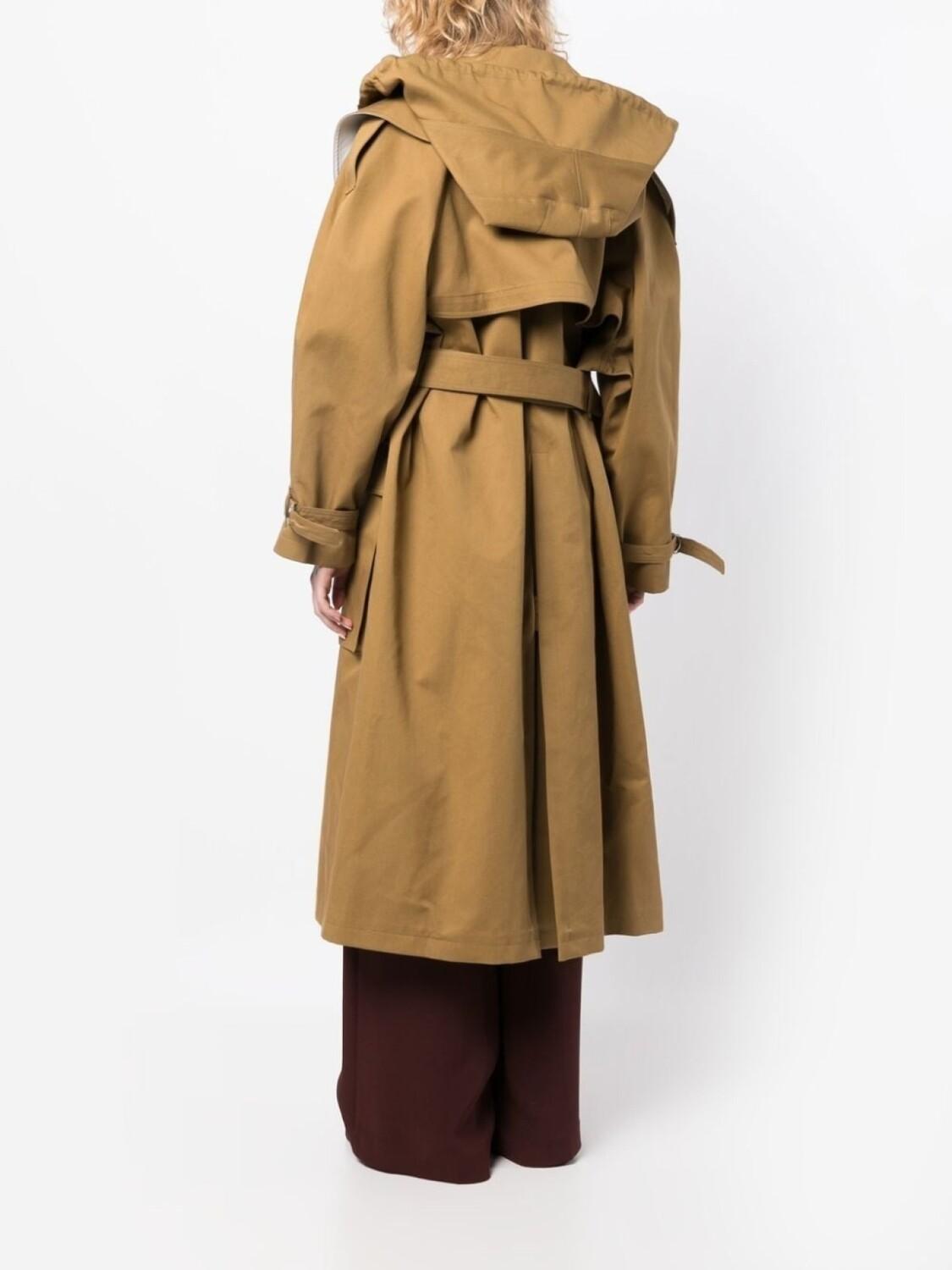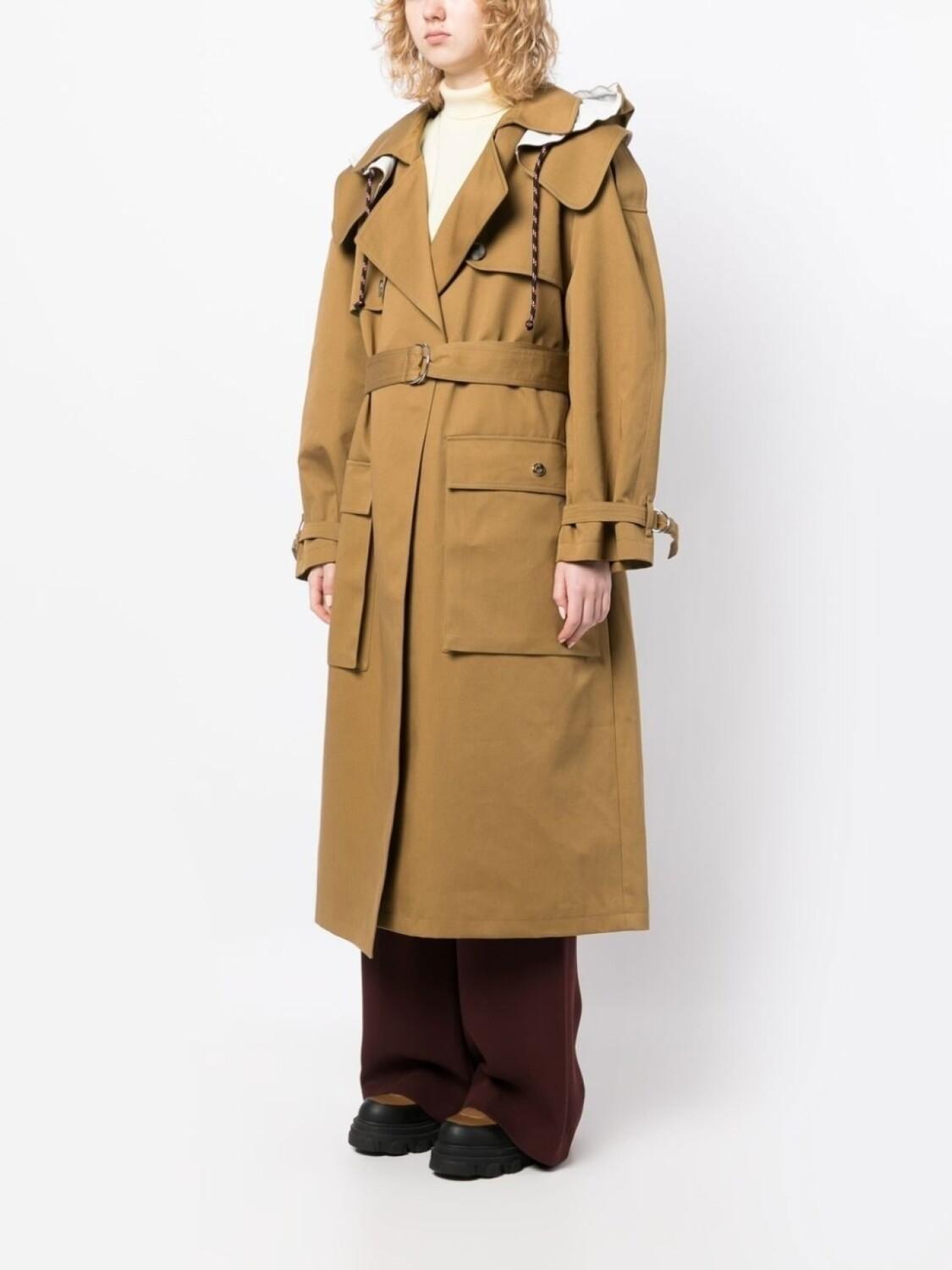 Коричневый, хлопок, двубортная застежка на кнопки, штормовая заслонка, объемный капюшон на шнурке, застежка с D-образной пряжкой, два передних кармана, длинные рукава, манжеты с завязками и оправа оверсайз.