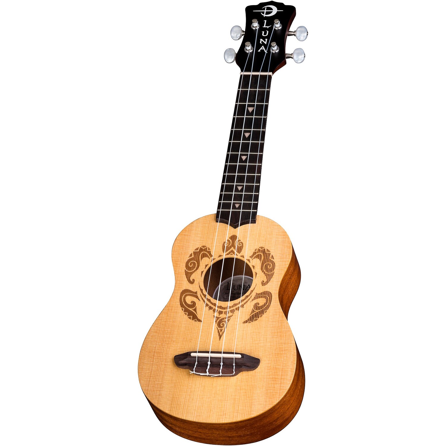 Корпус из красного дерева, верхняя часть из ели с выгравированным лазером мотивом черепахи. Укулеле Luna Guitars Honu Turtle Spruce Soprace Soprano украшено украшениями, вдохновленными традиционными гавайскими татуировками на теле. Узоры и расположение гавайских татуировок были строго геометрическими, со множеством форм и символов, представляющих природный мир острова: камни, волны, рыбы, акулы, черепахи, дождь, солнце, птицы. Этот дизайн Honu Turtle Spruce Soprano основан на гавайской черепахе (хону), символе долголетия и выносливости, выполненном в стиле полинезийской татуировки. Маркеры ладов представляют собой стилизованные зубы акулы.