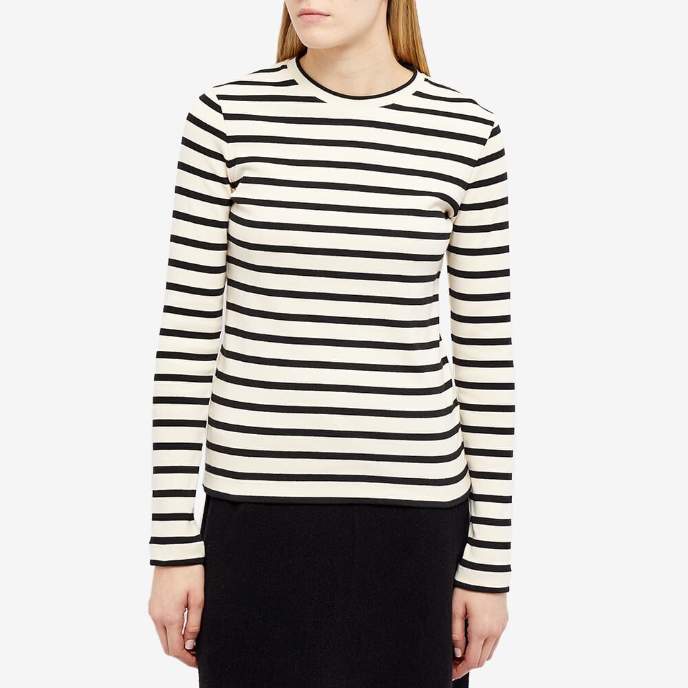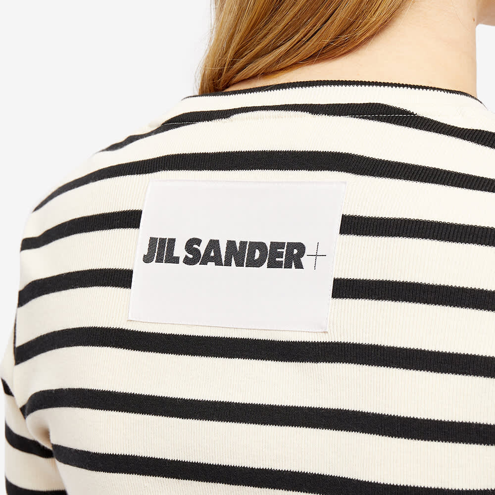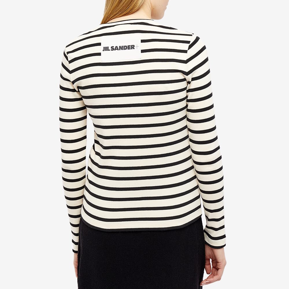 Линии одежды немецкого дизайнера Jil Sander, известного как «Королева Less», остаются такими же минималистичными и четкими, как всегда. Минималистичная, но стильная футболка с длинным рукавом и полосатым дизайном.