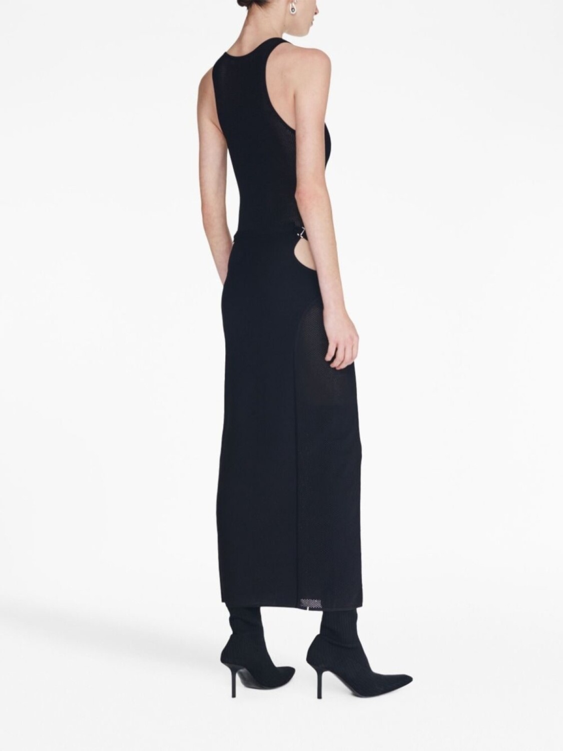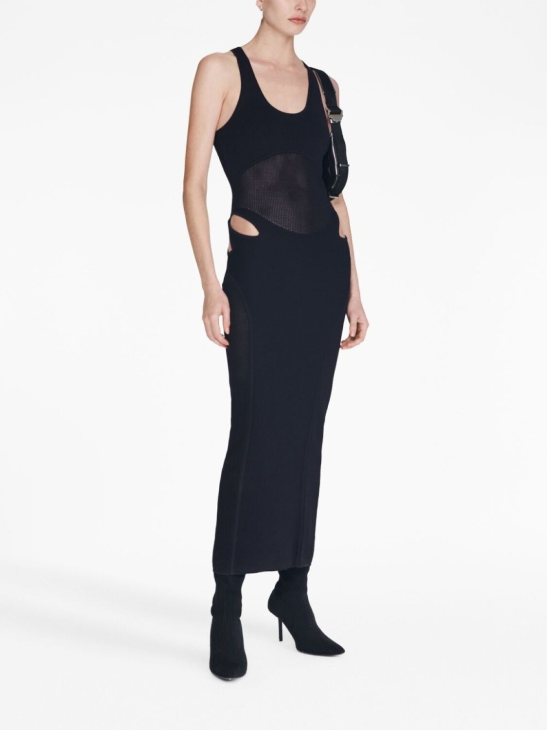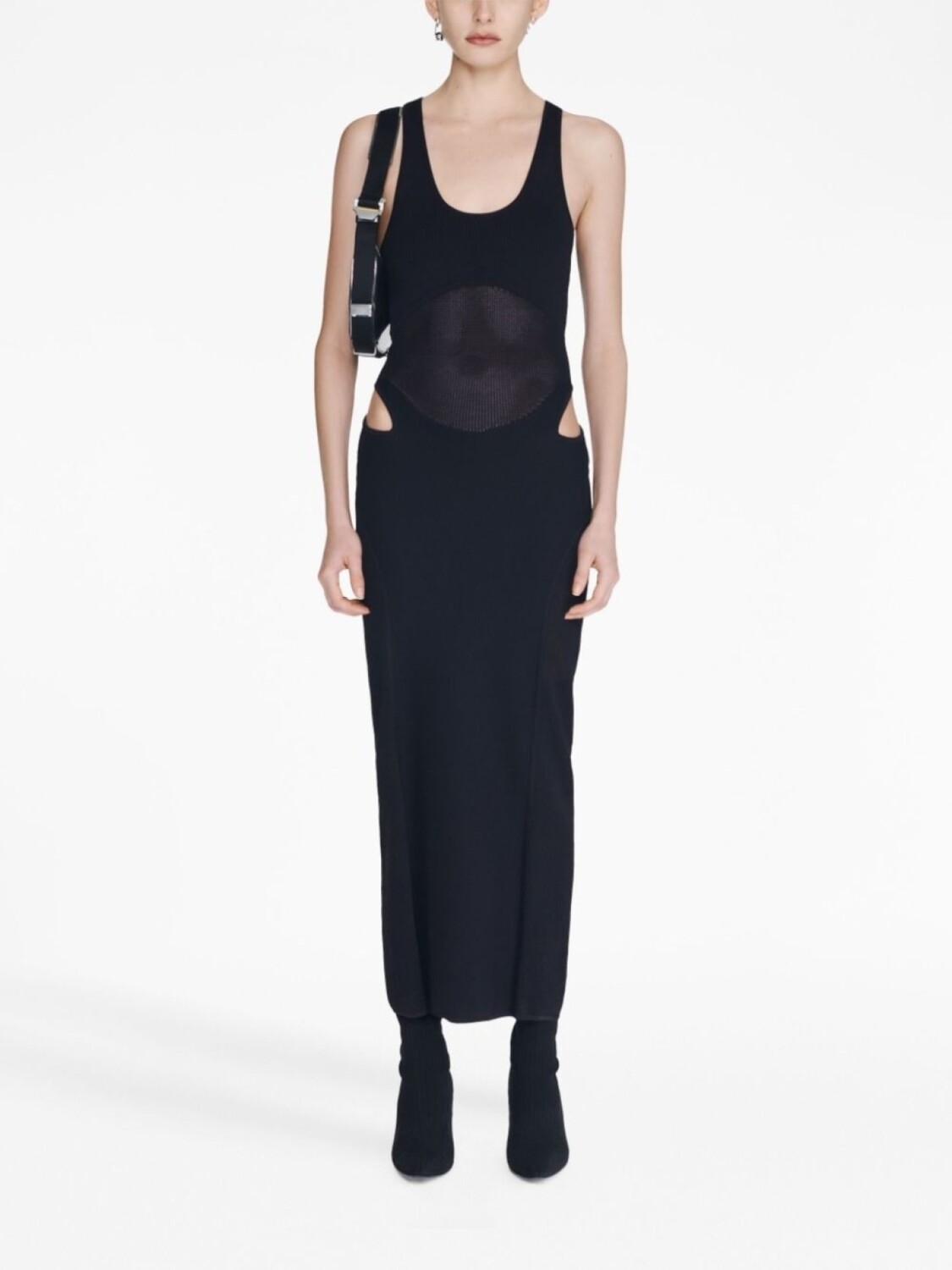 Черный, эластичный материал, кроше, прозрачное покрытие, вырезные детали, U-образный вырез, застежка на молнии сзади, вырез рейсер, без рукавов, прямой подол и длинная модель.