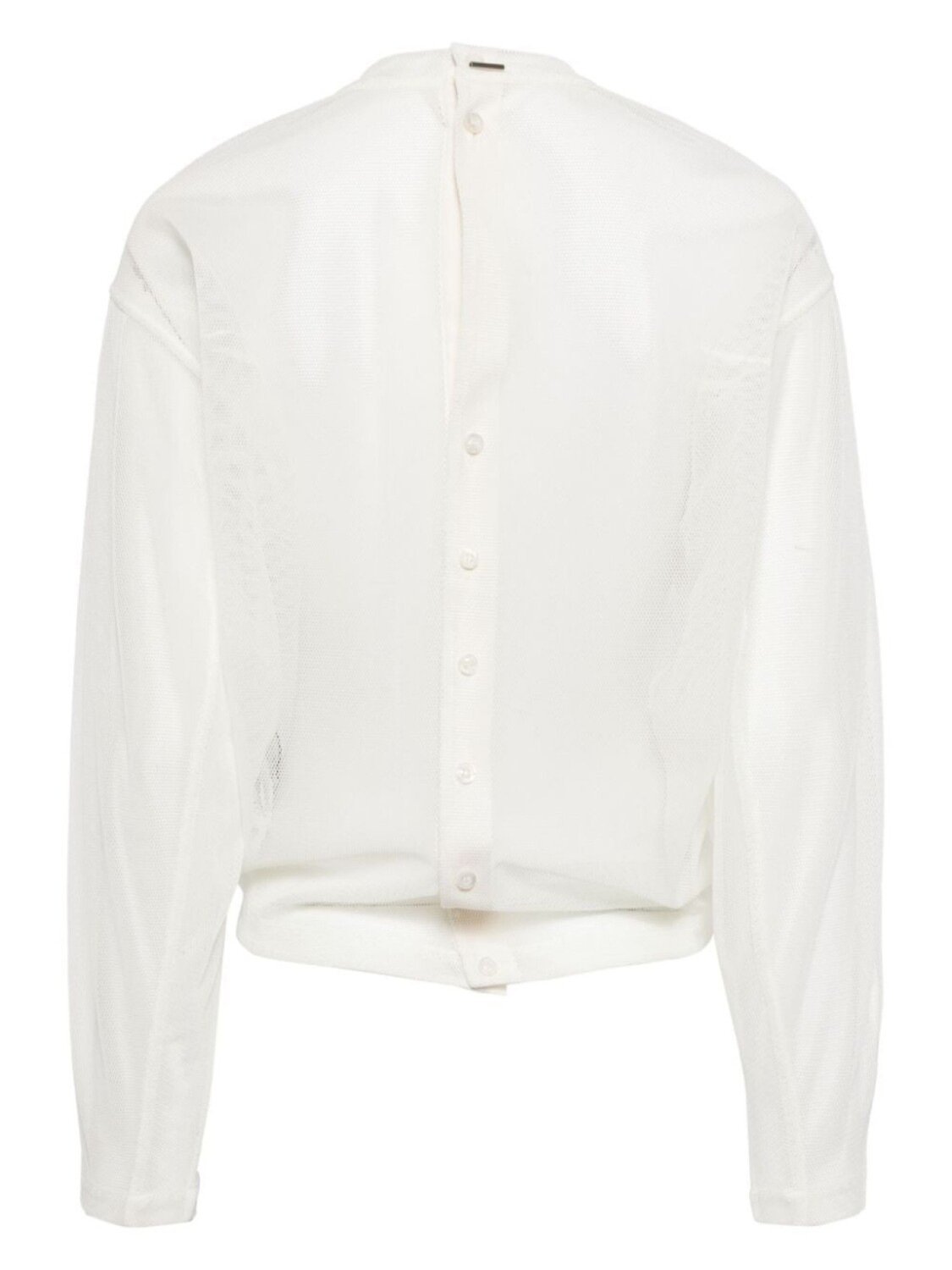 Белый, ткань джерси, полупрозрачный дизайн, круглый вырез, застежка на пуговицы сзади, длинные рукава, прямой подол