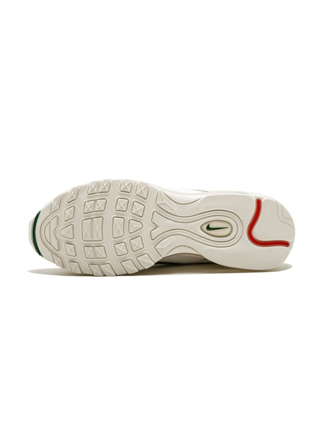Белые кроссовки 'Air Max 97 OG/UNDFTD' со вставками из матовой и лакированной кожи от Nike (Найк). Редкая расцветка из коллаборации с культовым брендом Undefeated отражает любовь итальянцев к этой модели. Фигурные вставки из лакированной кожи для защиты от загрязнений, по бокам - волнообразная отделка в красных и зеленых тонах и надписи 'Undefeated', фирменная светоотражающая деталь '3M', фирменная стелька. Каждое изделие проходит строгую процедуру аутентификации, которая позволяет подтвердить состояние вещи, а также историю ее происхождения и владения.