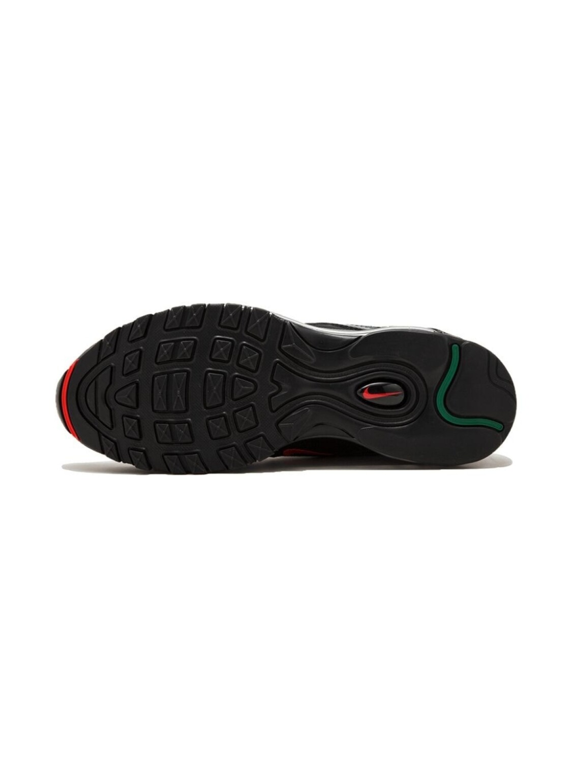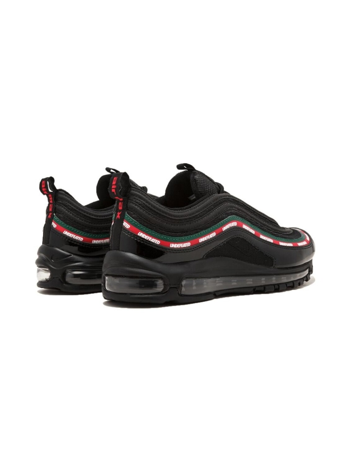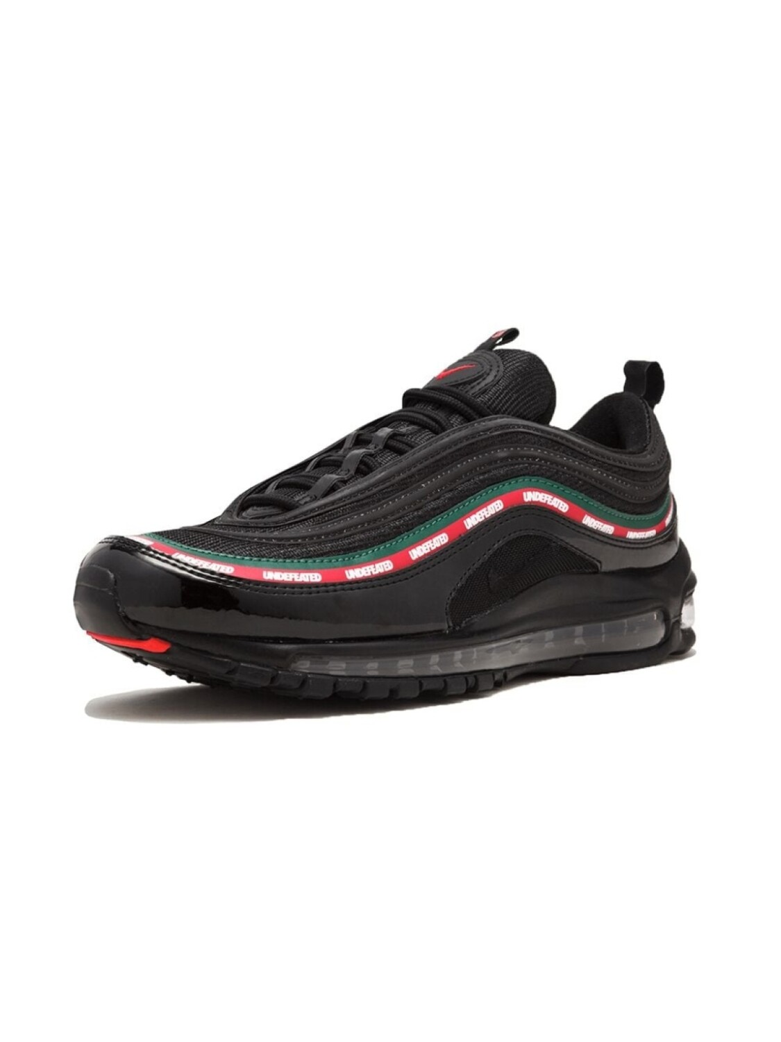 Черные кроссовки 'Air Max 97 OG/UNDFTD' со вставками из матовой и лакированной кожи от Nike (Найк). Модель из коллаборации с культовым брендом Undefeated. Фигурные вставки из лакированной кожи для защиты от загрязнений, по бокам - волнообразная отделка в красных и зеленых тонах и надписи 'Undefeated', фирменная светоотражающая деталь '3M', фирменная стелька. Каждое изделие проходит строгую процедуру аутентификации, которая позволяет подтвердить состояние вещи, а также историю ее происхождения и владения.