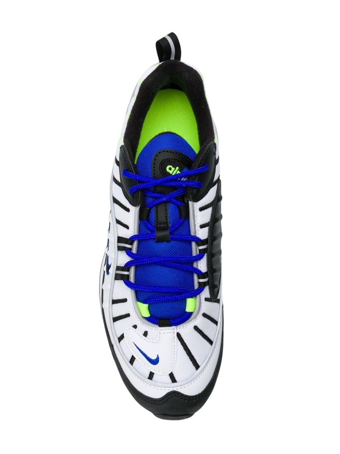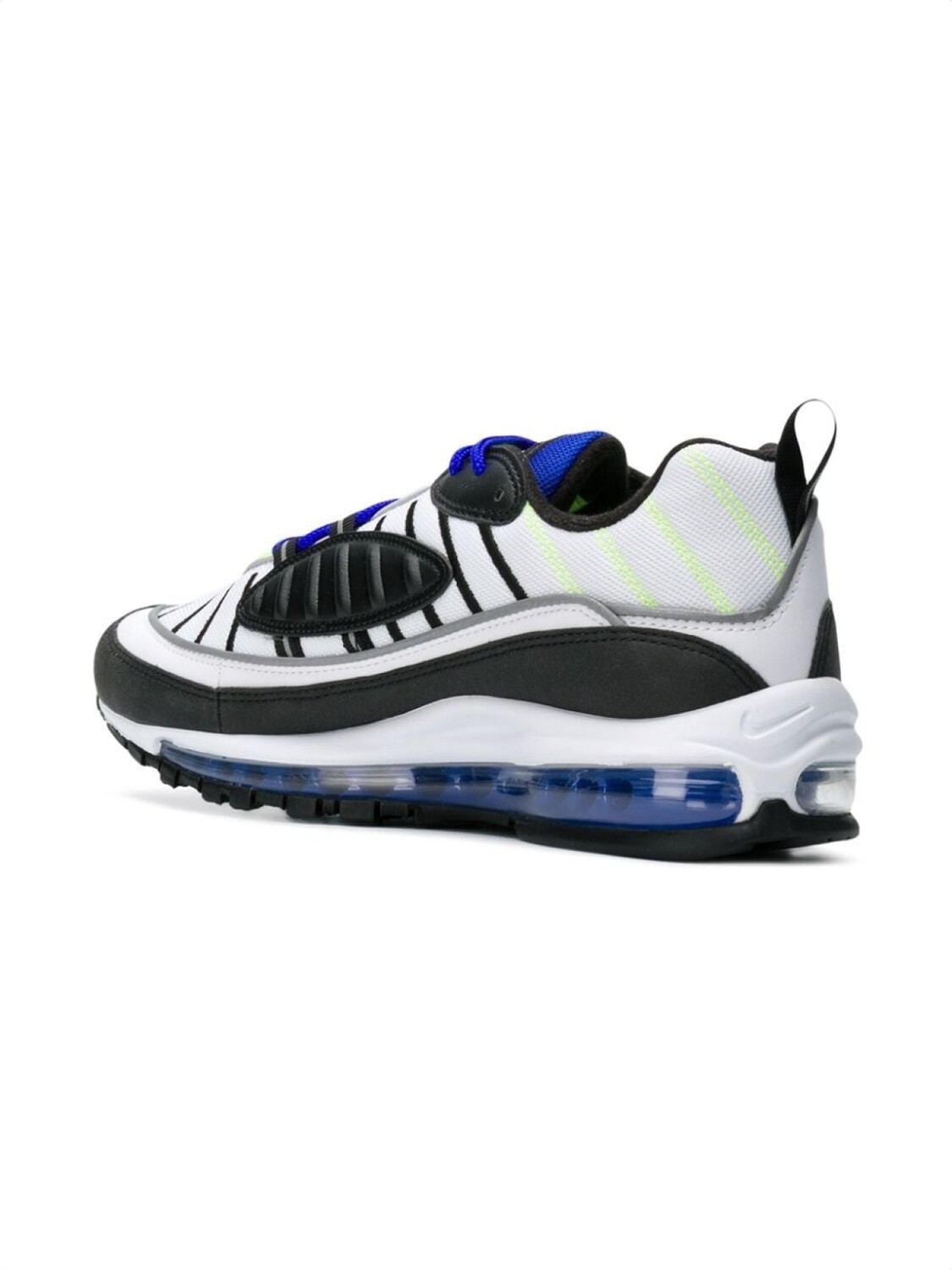 Белые кроссовки 'Air Max 98' от Nike(Найк). Закругленный носок, шнуровка спереди, заплатка с логотипом на язычке, фирменная стелька, уплотненная щиколотка, петля для подтягивания сзади, фирменная галочка Nike, фирменная стелька Nike Air.