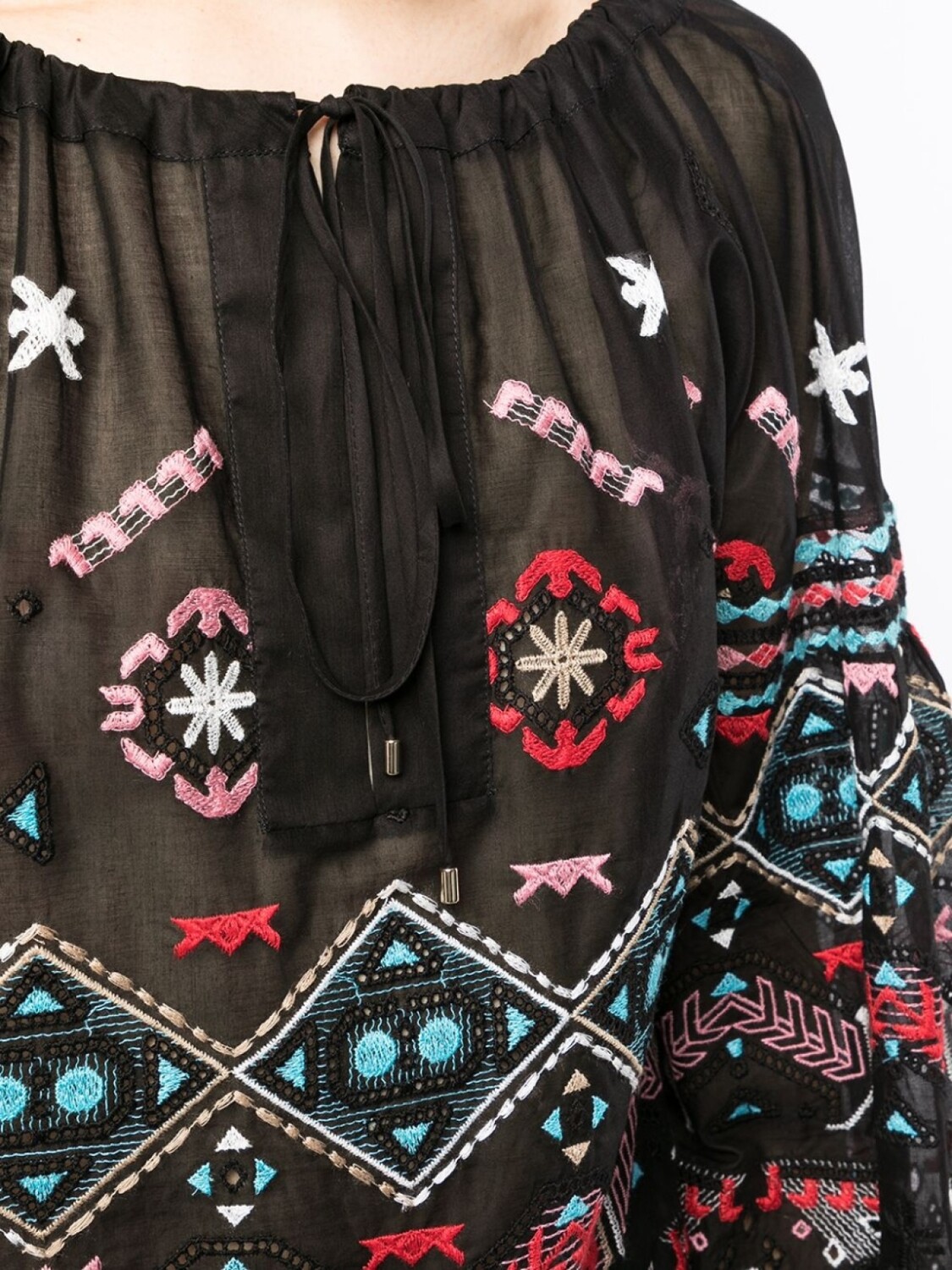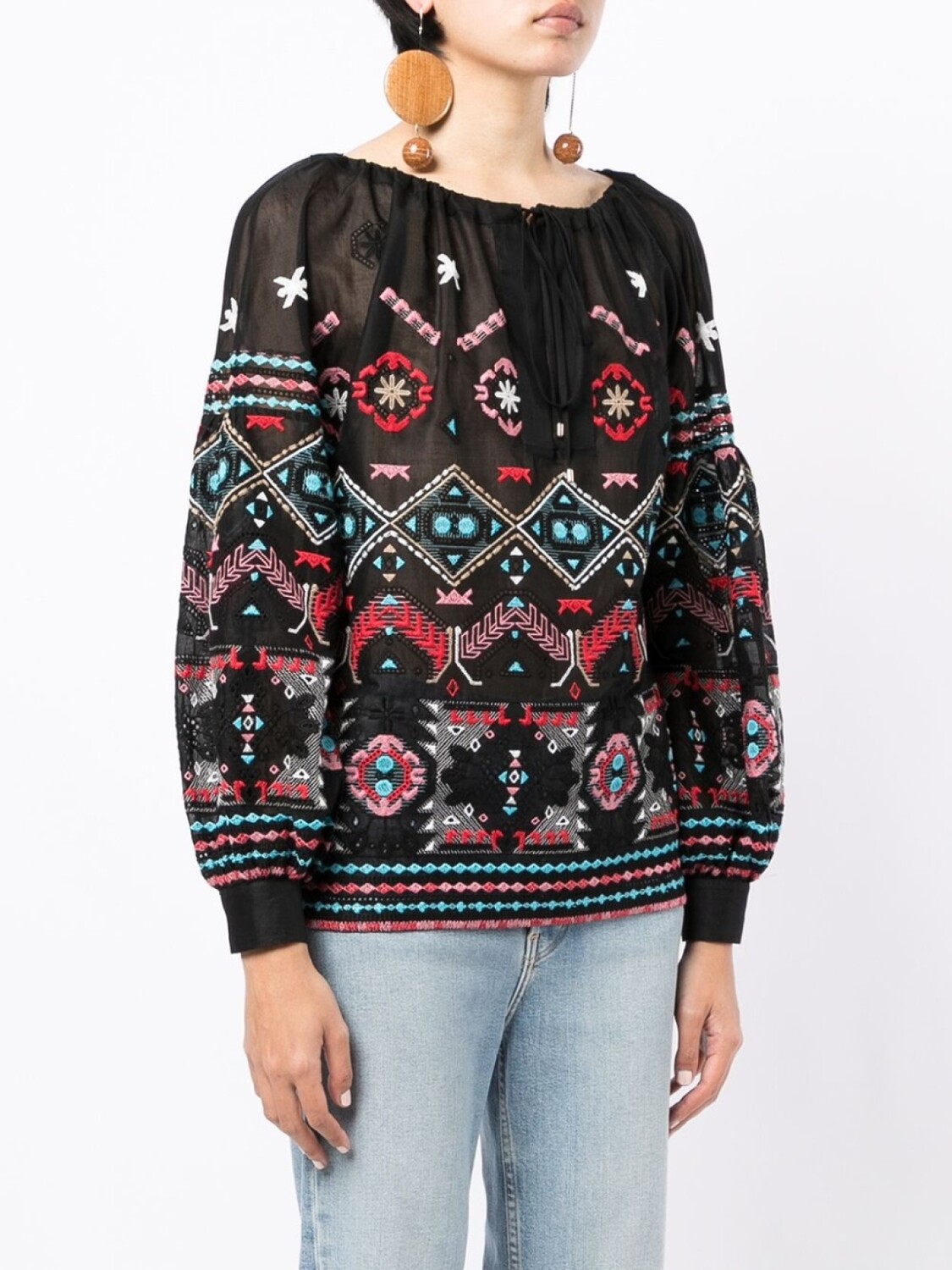 Полупрозрачный дизайн, вышивка, завязки спереди, длинные рукава и прямой подол.