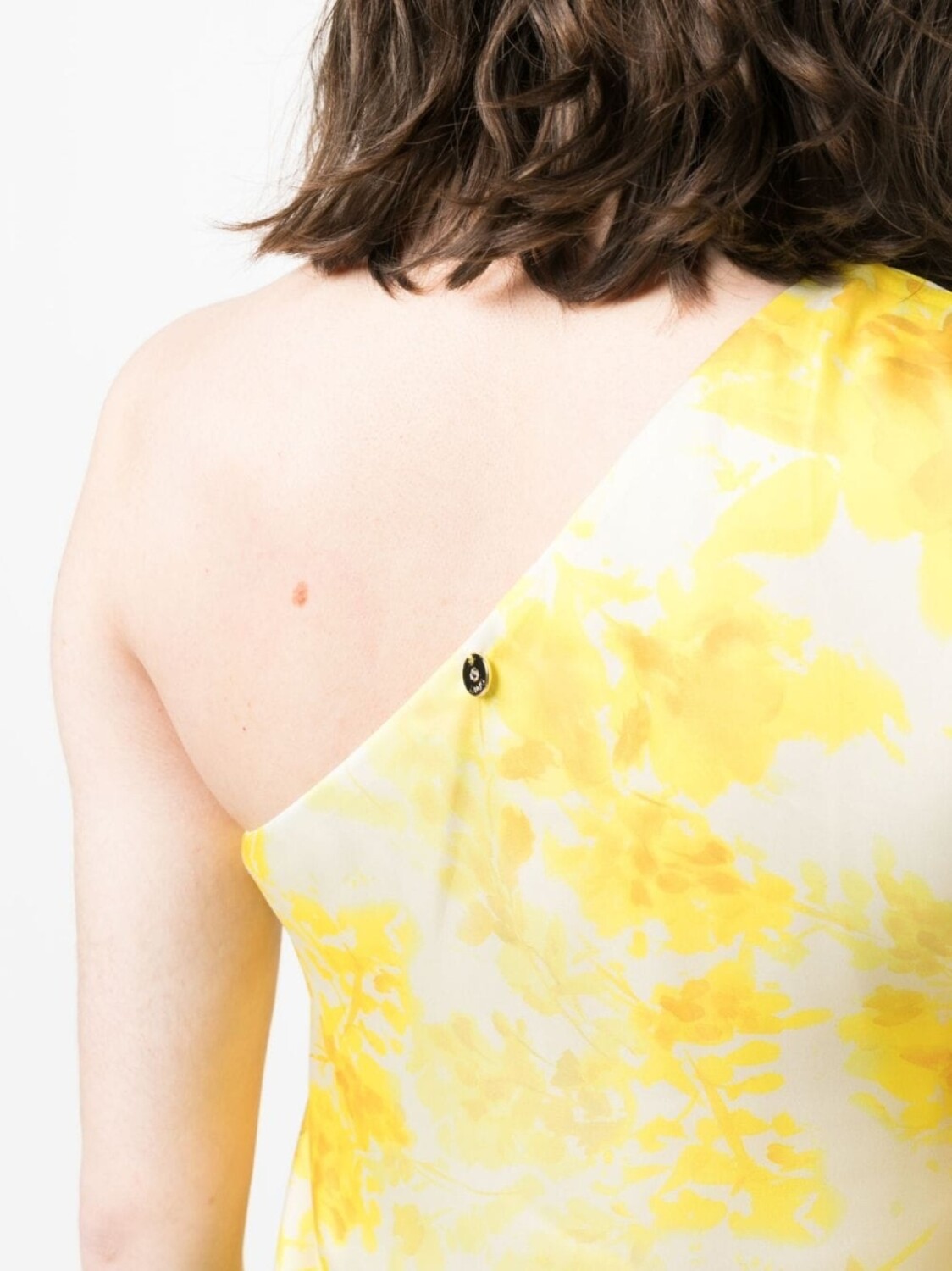 Желтый цитрон, цветочный принт, открытые плечи, один длинный рукав и подол с оборками.