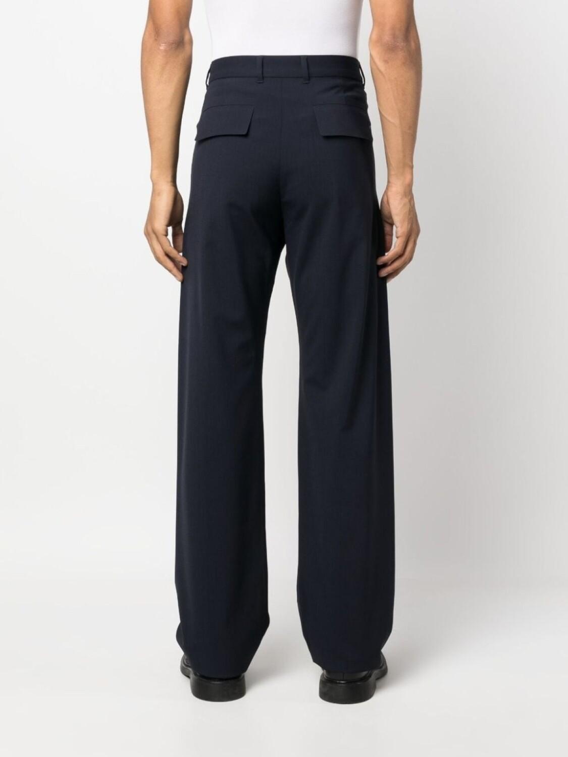 Темно-синий, смесовая шерсть, классический крой, прямой крой, завышенная талия, потайная застежка спереди, петли для ремня, два прорезных кармана по бокам и два кармана с клапанами сзади.