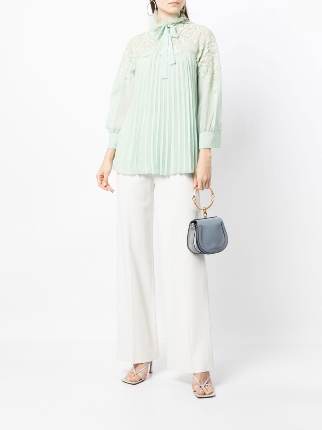 Пастельно-зеленый, кружевные вставки, складки, воротник с бантом, длинные рукава и прямой подол.