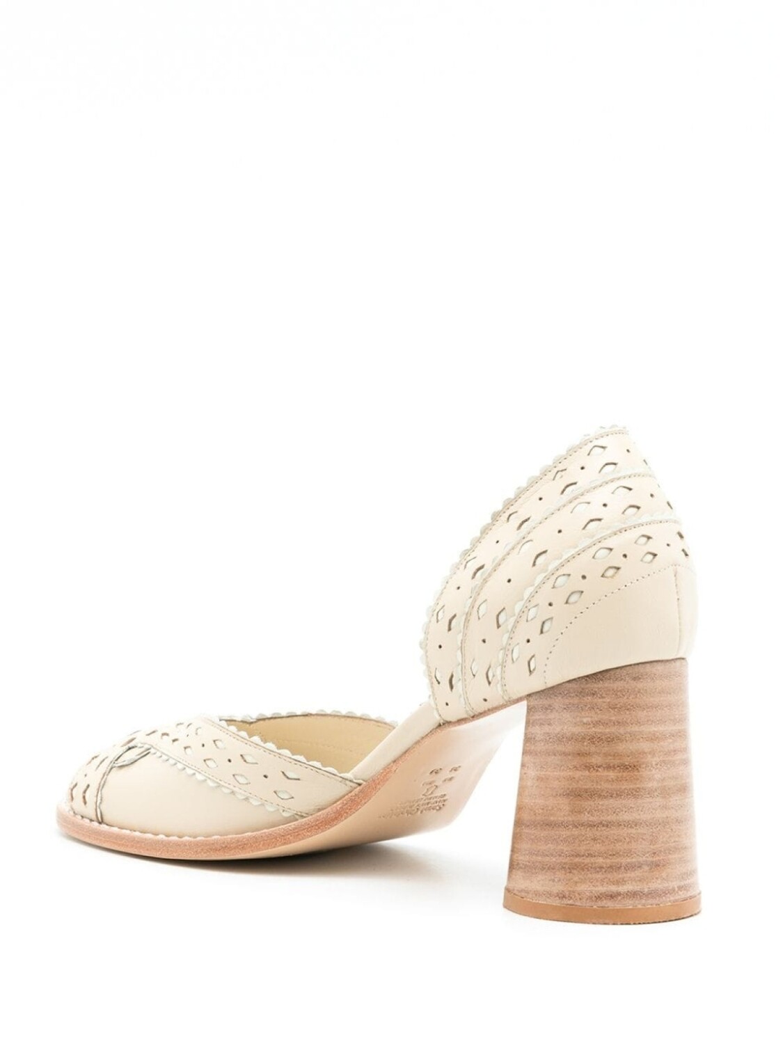 Тональная строчка, кожаная стелька с логотипом, наборная деревянная подошва и открытый носок.