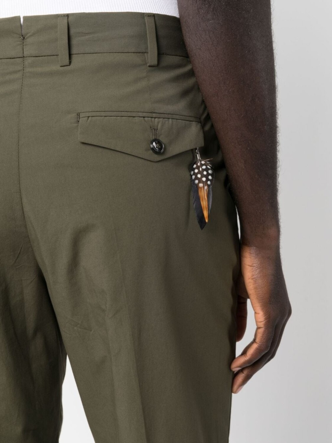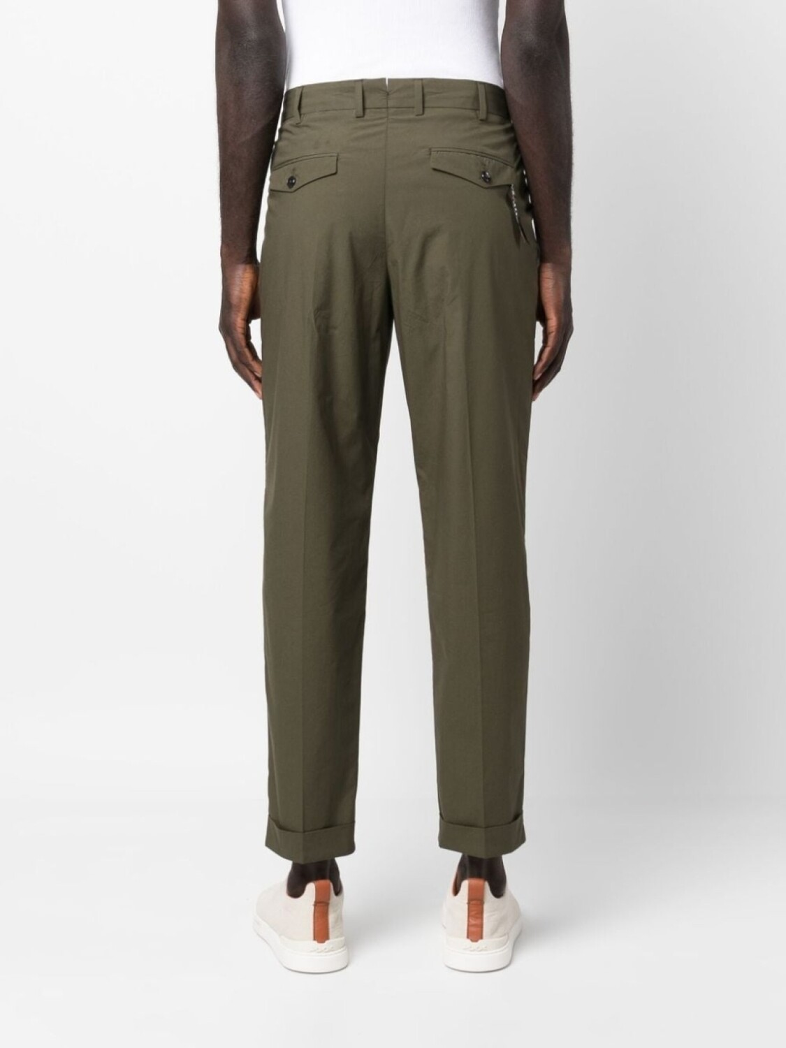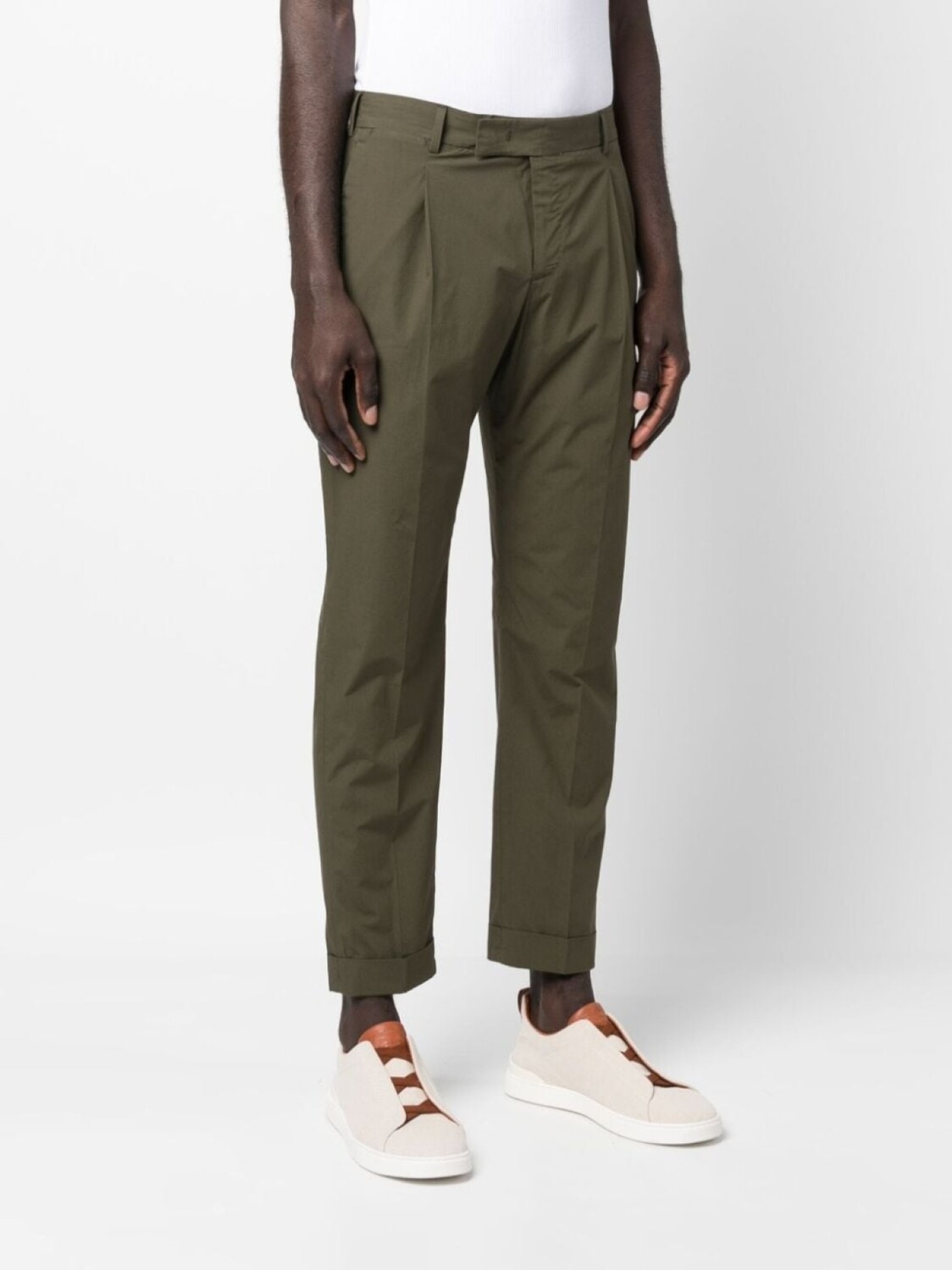 Хаки, эластичный хлопок, складки, стрелки, петли для ремня, потайная застежка спереди, два прорезных кармана по бокам, два кармана на пуговице сзади и подвернутые манжеты.