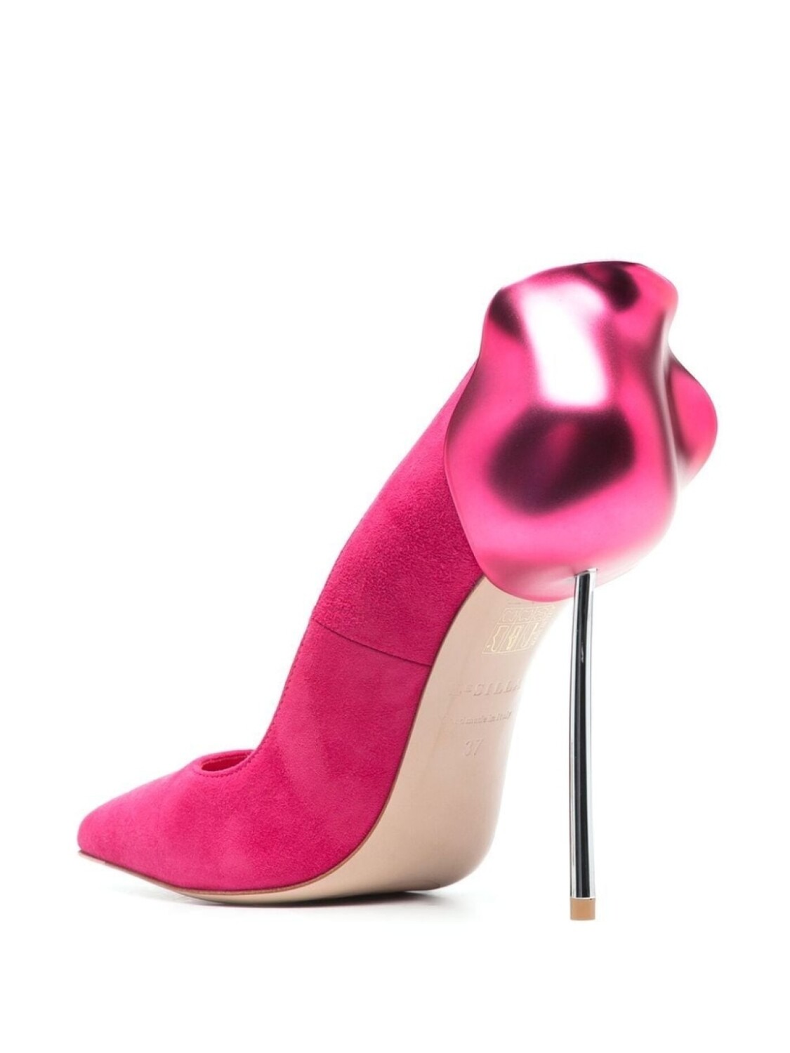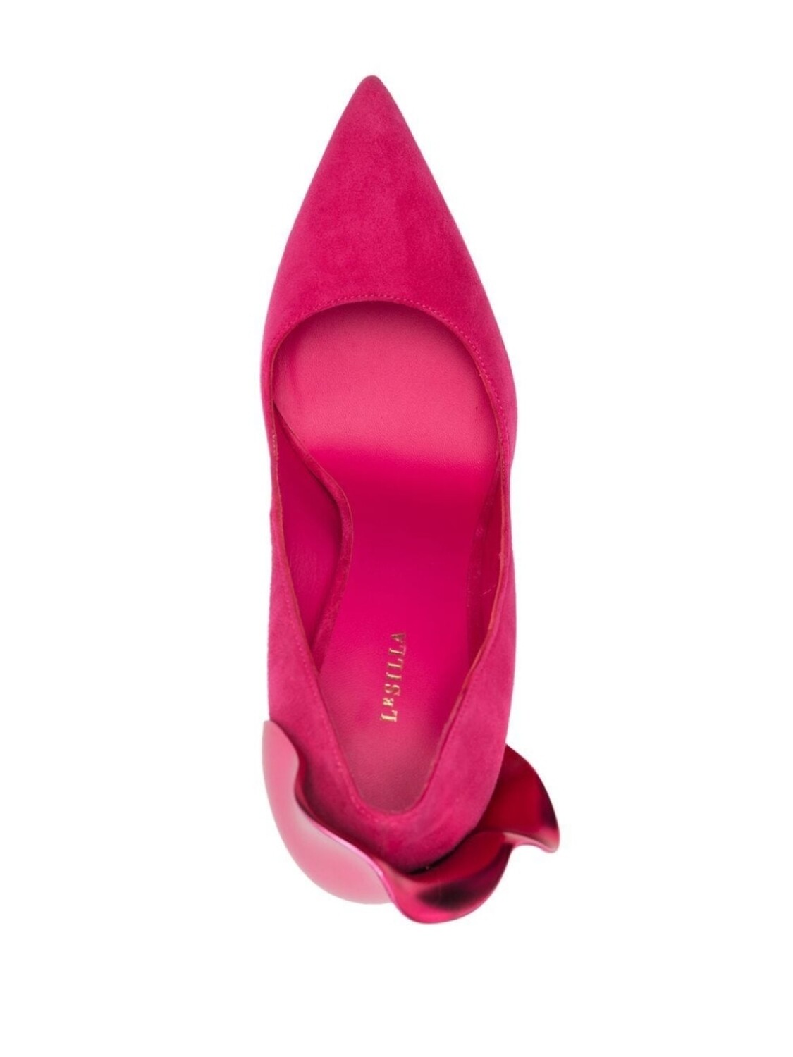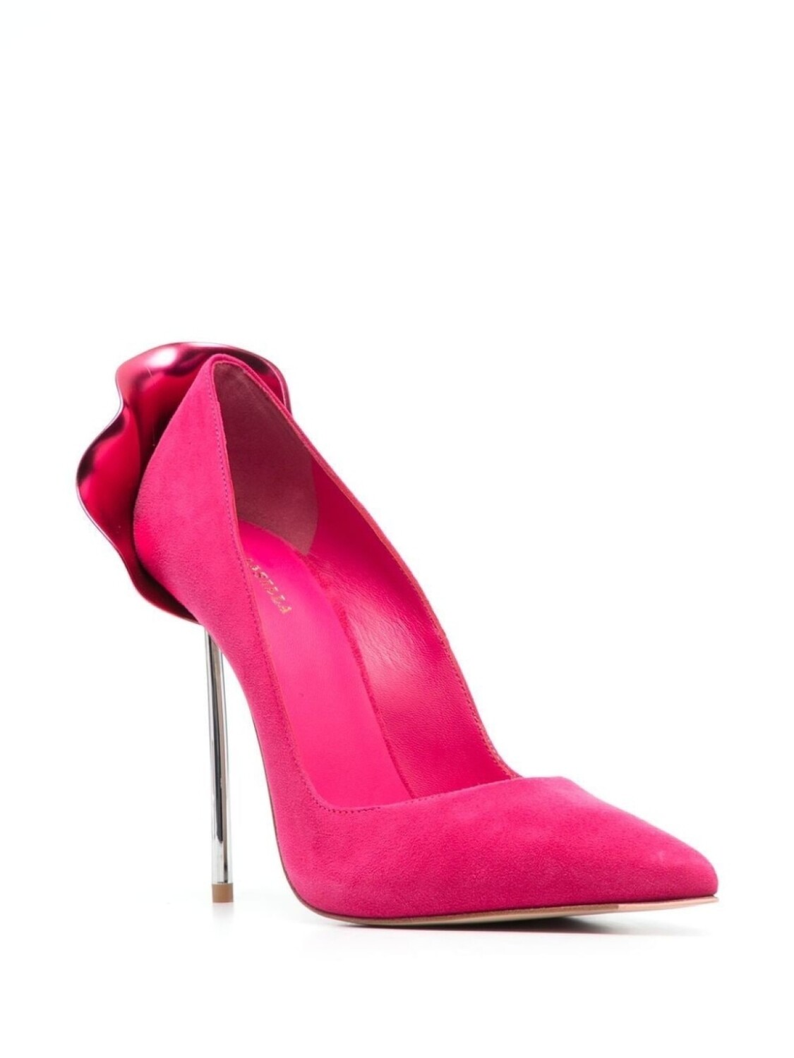 Фуксия, замша из телячьей кожи, цветочная деталь, заостренный носок, каблук на высокой шпильке, кожаная стелька с логотипом и кожаная подошва.