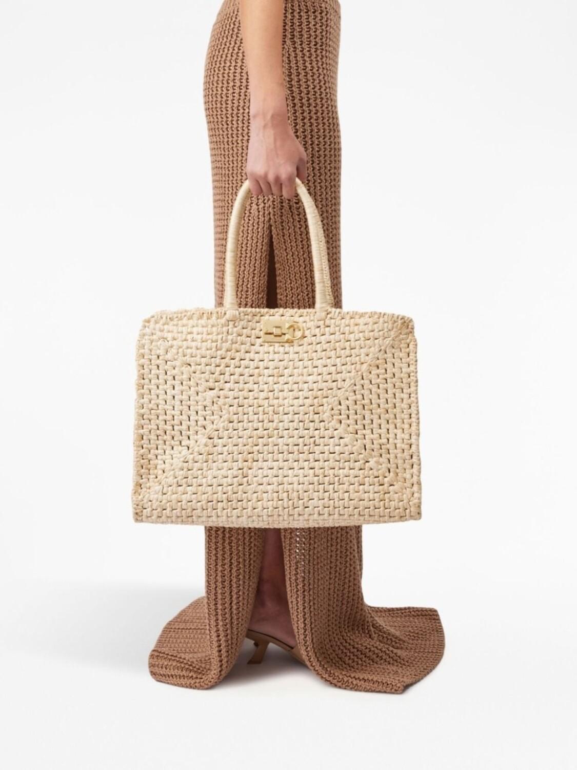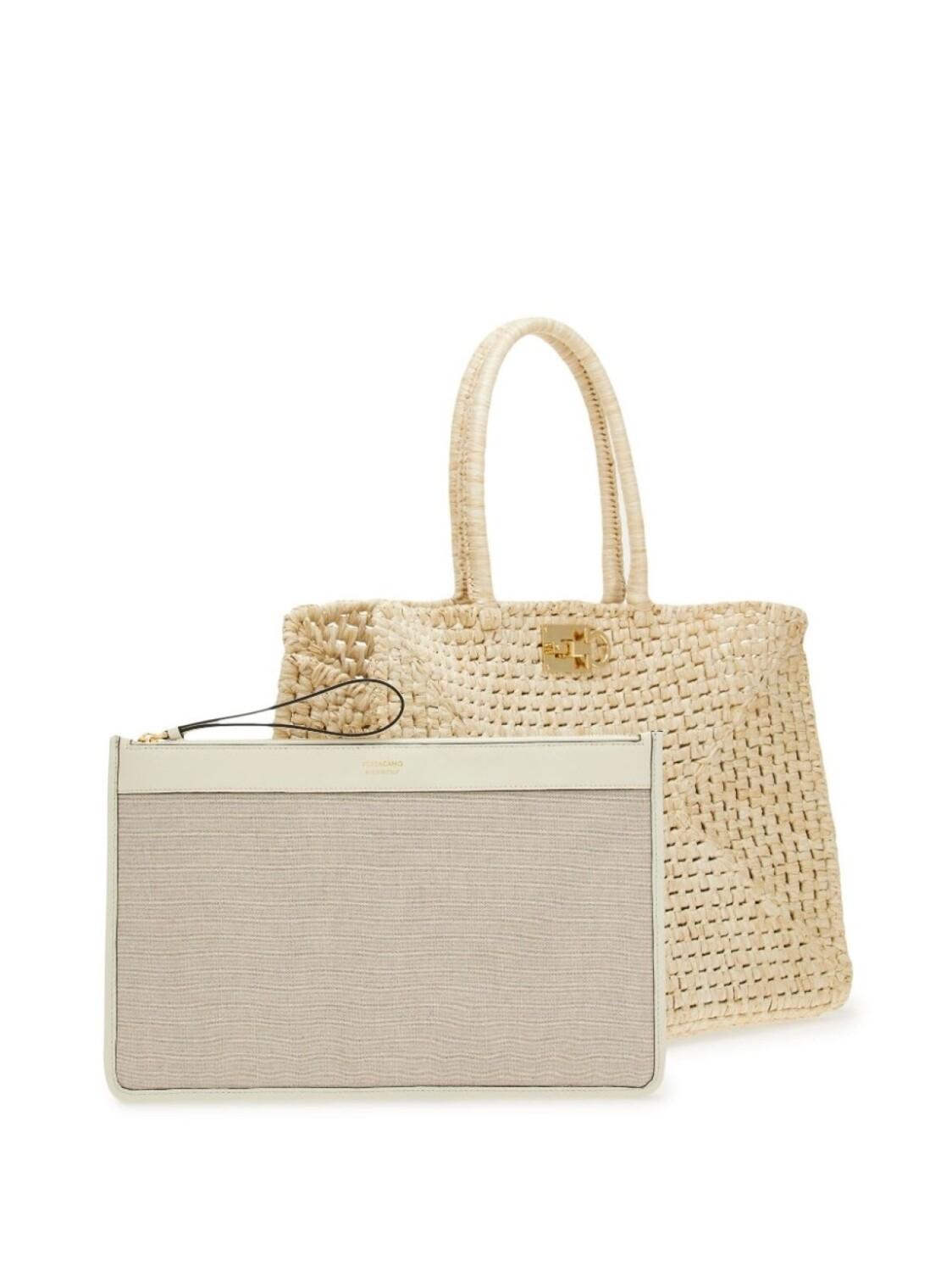 Миндальный, рафия, переплетенный дизайн, пряжка Gancini, нашивка с логотипом внутри, две закругленные верхние ручки и основное отделение.