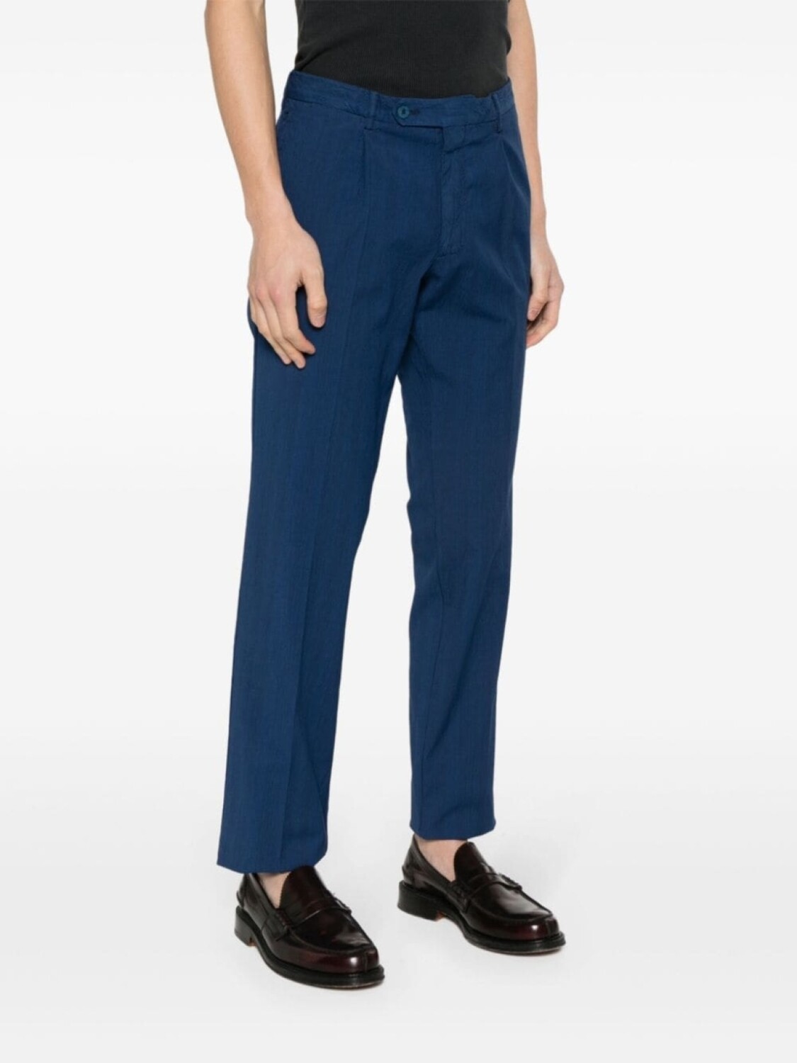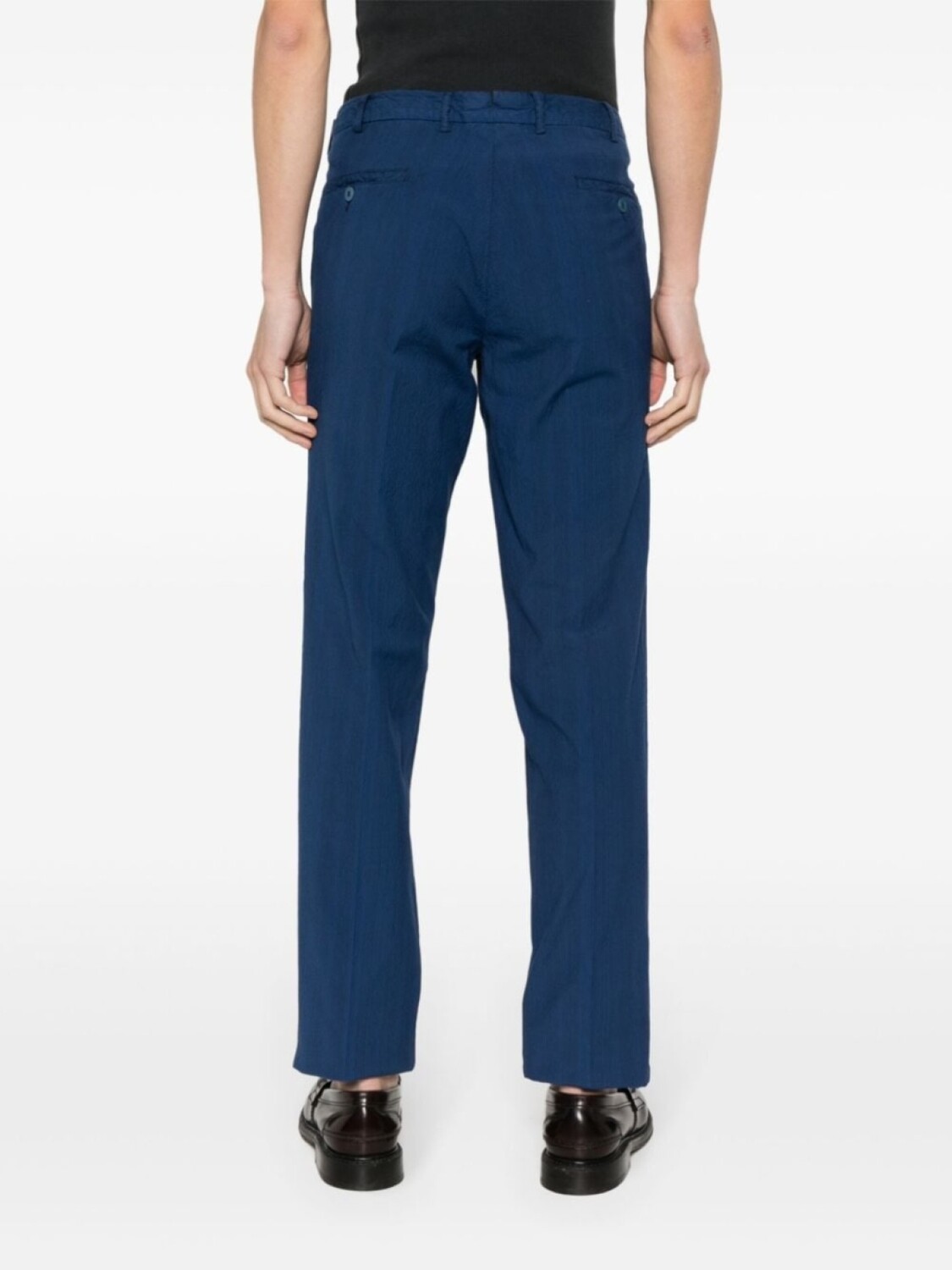 Темно-синий, смесовый хлопок, сирсакер, узор в вертикальную полоску, петли для ремня, два прорезных кармана по бокам, складки спереди, стрелки, длина в пол, два кармана на пуговице сзади, узкий крой, смещенная застежка на молнии и пуговицах спереди