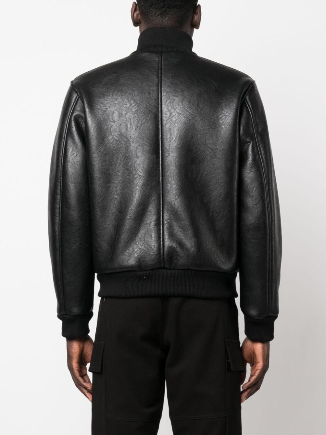 Черный, искусственная кожа, хлопок, глянцевая фактура, серебристый металлический логотип, серебристая фурнитура, вертикальный шов, высокий воротник, застежка на молнии спереди, длинные рукава, два кармана на молнии по бокам и края в рубчик.