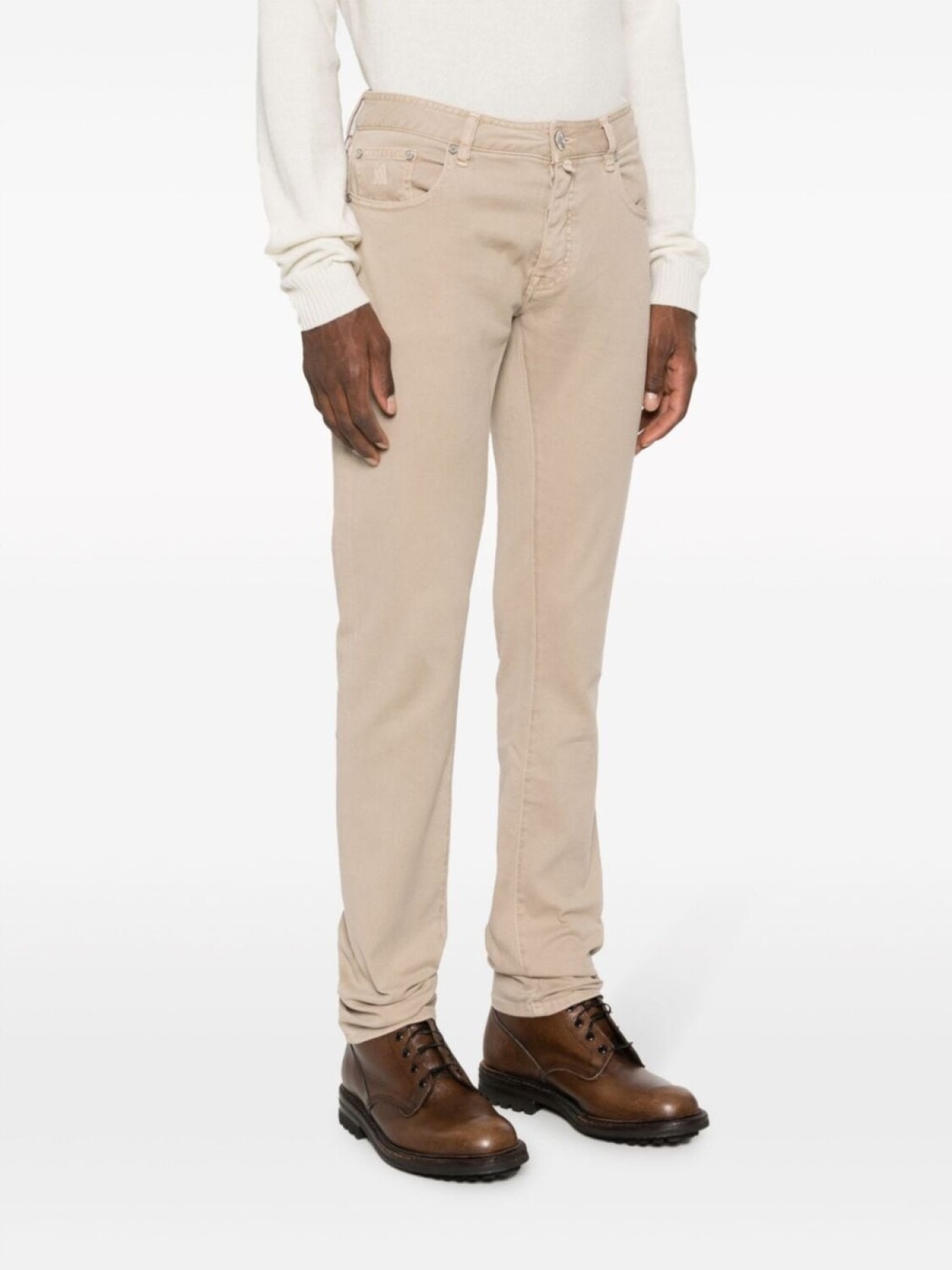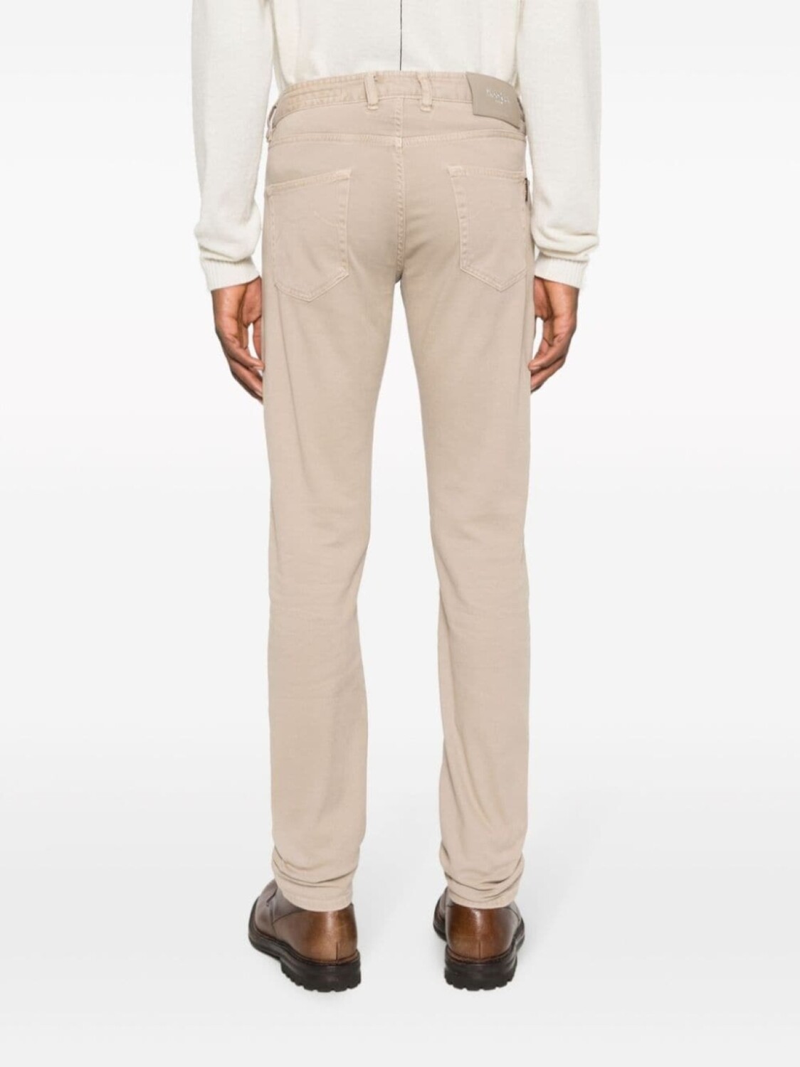 Бежевый, эластичный хлопок, средняя посадка, прямой крой, застежка на молнии и пуговице спереди, петли для ремня, пять карманов, нашивка с логотипом сзади и два накладных кармана сзади.