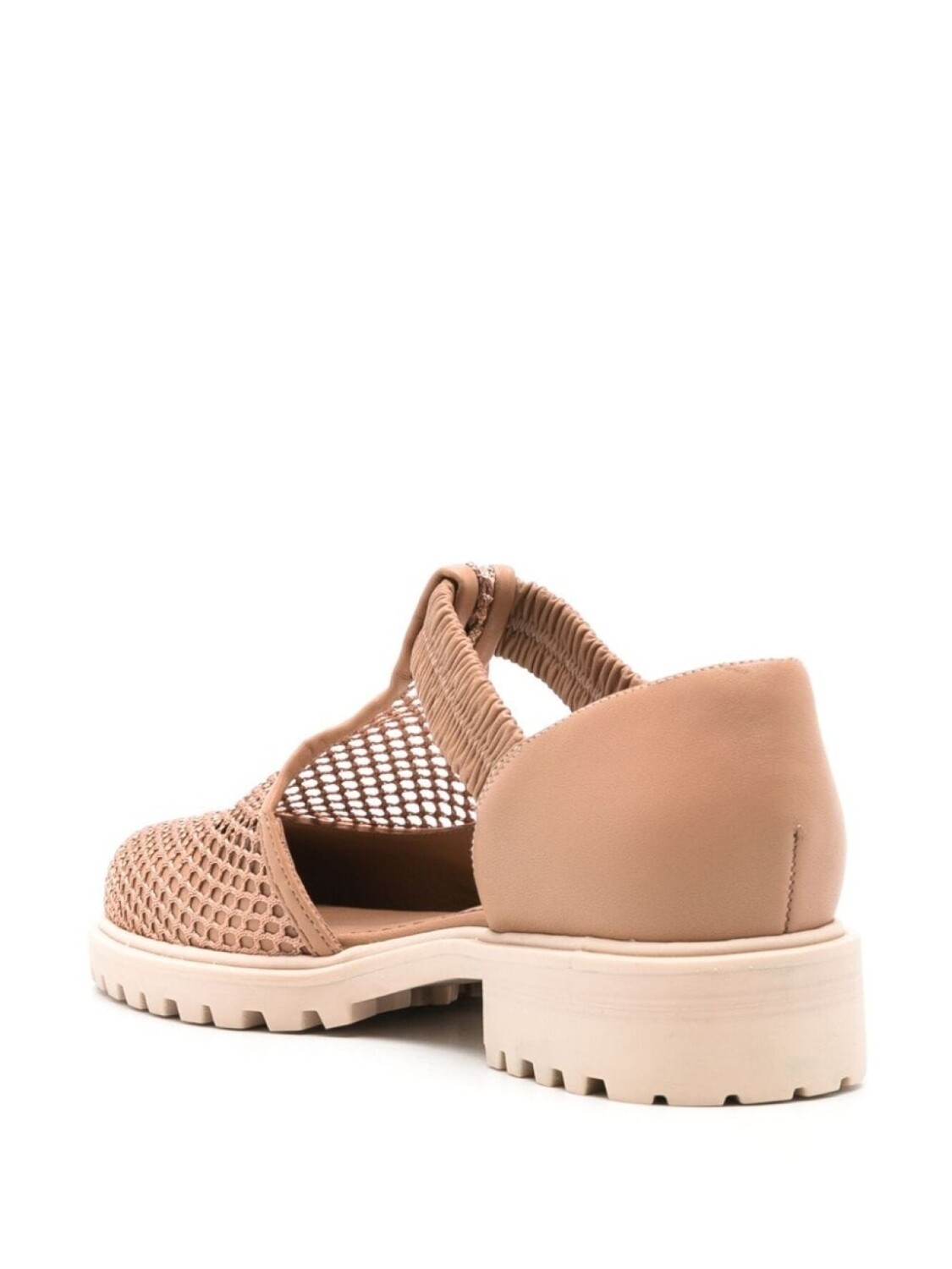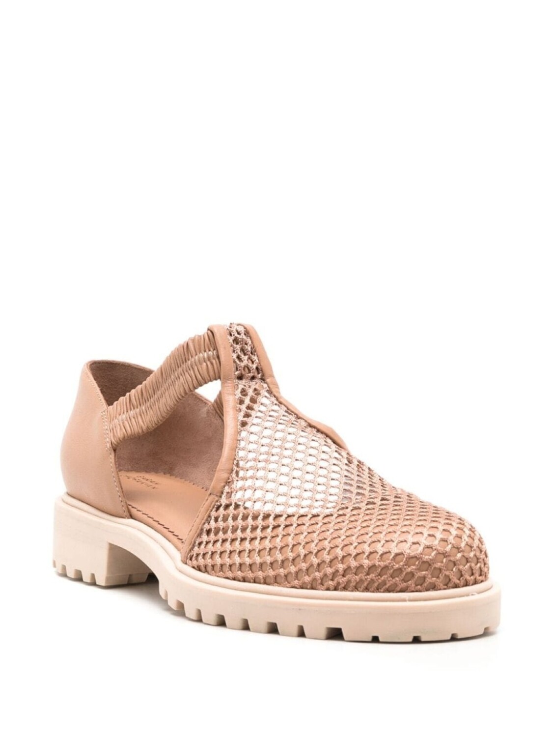 Бежево-коричневый, кожа, кожаная стелька с логотипом, ажурная вязка, закругленный носок, модель без застежки, низкий каблук и рифленая резиновая подошва.